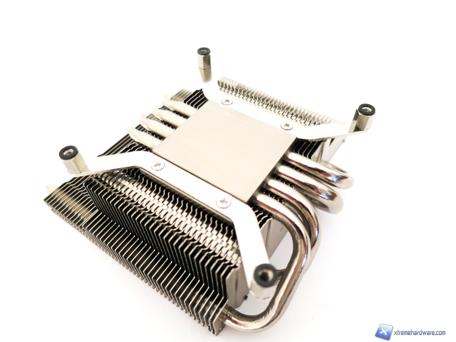 Come abbiamo visto dalla confezione, DeepCool ha adottato un’idea molto carina e cioè quella di dividere il comparto del dissipatore con il relativo bundle e quello della ventola. Estratto dunque tutto il materiale dalla confezione, ci troviamo di fronte la sola struttura del DeepCool Gabriel che dovrà essere “assemblata”. Le dimensioni del DeepCool Gabriel sono di 120 X 118 X 40mm per un peso di 426 grammi quindi rientra pienamente nella categoria dei dissipatori di ridotte dimensioni e indicati per assemblare un sistema ITX da abbinare ad un HTPC. Con ventola installata l’altezza totale è di soli 60mm. Il DeepCool Gabriel inoltre appartiene alla categoria dei dissipatori chiamati comunemente “Top Down”. La maggior parte di questi dissipatori utilizzano una forma a C, con due are distinte di dissipazione, mentre in questo caso il DeepCool Gabriel ha un’unica struttura in alluminio che permette un maggiore scambio termica direttamente dalla base di contatto alla struttura lamellare. Il DeepCool Gabriel viste le dimensioni si presta ad essere impiegato facilmente su ogni scheda madre, facendo però attenzione ad eventuali dissipatori per le fasi di alimentazione. Essendo stato ideato principalmente per sistemi di ridotte dimensioni generalmente non dovremo preoccuparci di questo fattore.