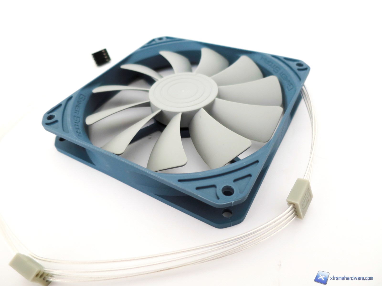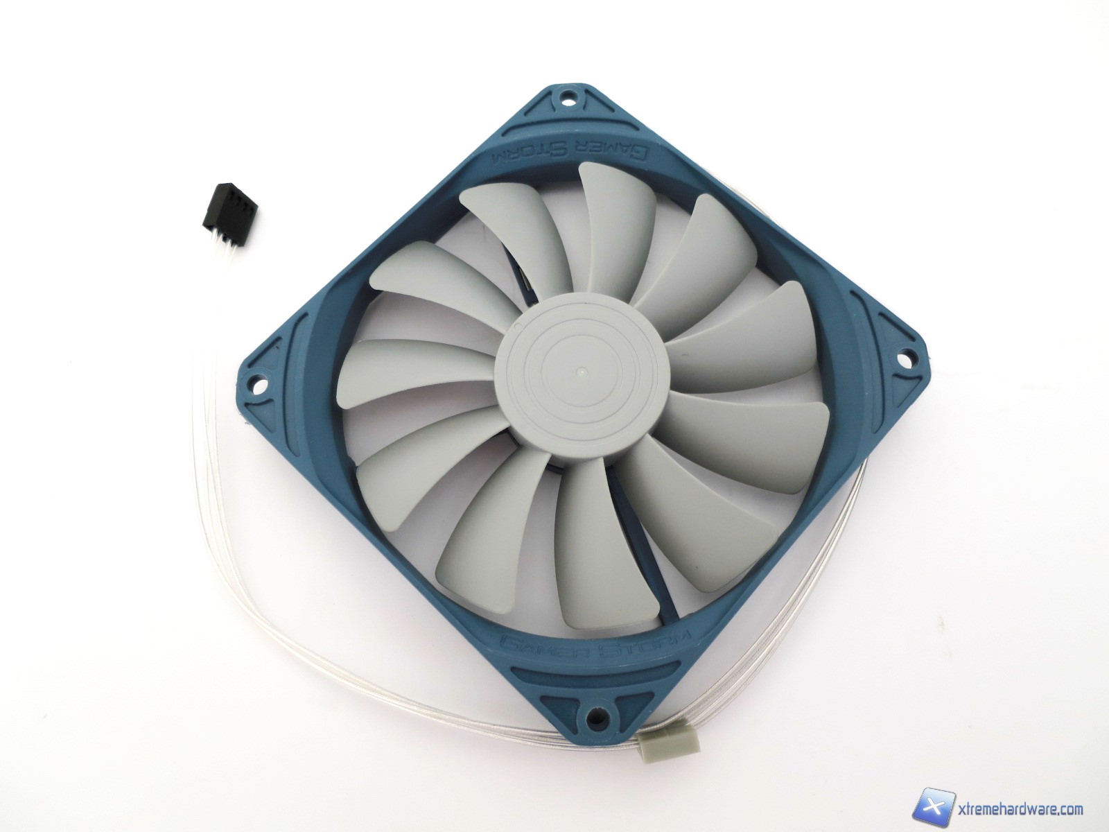 Con il DeepCool Gabriel viene fornito in bundle una ventola da 120 millimetri con spessore di 20 millimetri e connettore PWM. Come intuiamo la ventola ha un design low profile quindi non potrà essere sostituita con una di spessore standard (25 millimetri) ma dovrà essere impiegata una ventola sempre low profile. Questo perché anche le clip metalliche in dotazione non permettono un montaggio alternativo o modifiche possibili per un’installazione con una ventola classica.