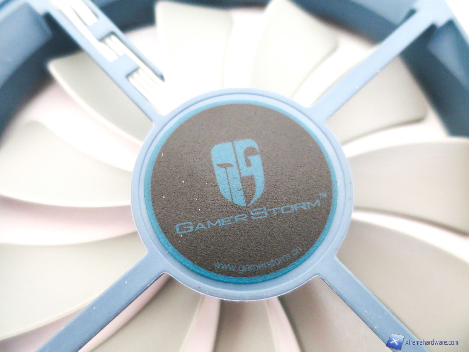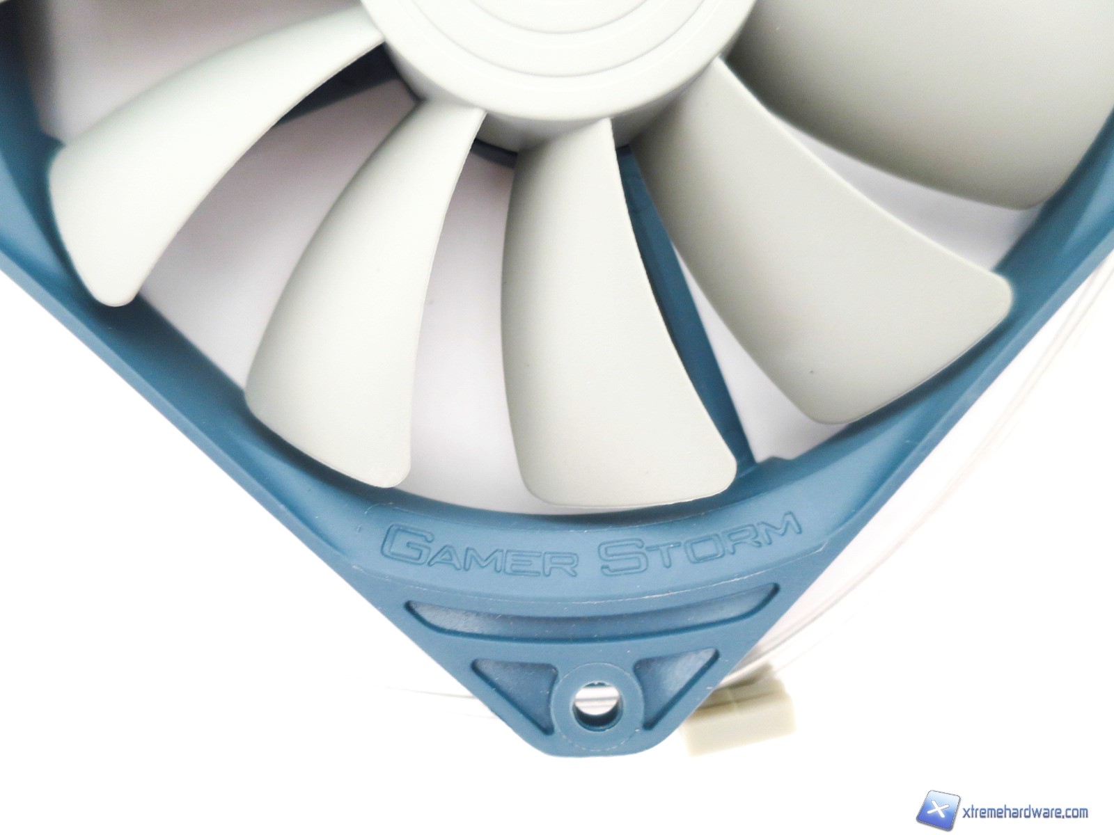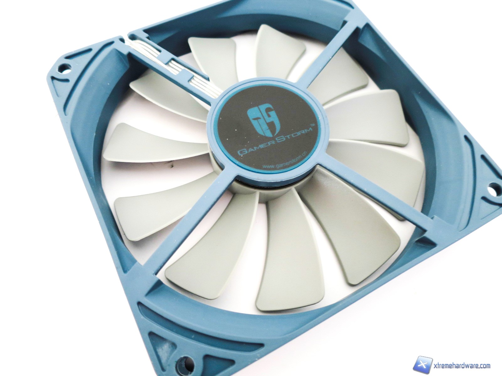 Andando ad analizzare la ventola ricordiamo che il modello incluso nel bundle del DeepCool Gabriel altro non è che il modello DeepCool GS120 venduto anche standalone quindi nel caso la ventola si rompa o smetta di funzionare potremo ripiegare sullo stesso modello o su un modello low profile. La ventola ha una colorazione un po’ insolita dal classico nero. Ci troviamo di fronte una ventola in colorazione blu scolorito. Nel dettaglio abbiamo il frame di questo blu poco naturale tendente quasi al violaceo mentre il motore così come le alette sono di un grigio chiaro che contrasta con il colore del frame. Le dimensioni sono precisamente 120 x 120 x 20 millimetri di spessore. Il design low profile con i 20mm di spessore è ideale per i sistemi HTPC, dove lo spazio a disposizione è sempre molto esiguo. Per quanto riguardo i dati tecnici della ventola, sono dichiarati una velocità di 900±150 / 1800±10%RPM con una portata massima di 61.93CFM ed un rumore al massimo dei giri di 32dBA partendo dai 18 dBA con una rotazione di 900RPM. Inoltre la ventola ha uno startup a 7 Volt con un range di potenza in funzione di 10.8~13.2 Volt. La ventola potrebbe anche presentare un design ed una colorazione che ad alcuni potrebbe non piacere ma i valori dichiarati non sono per nulla male e portano il DeepCool Gabriel ad essere un valido dissipatore per sistemi compatti. Ovviamente la ventola è dotata di un connettore PWM che permetterà quindi di variare la velocità in modo del tutto automatico alla temperatura della CPU. Potremo ovviamente utilizzare un Fan Controller per avere una gestione più personale della ventola. Il cavo questa volta non è in treccia di tessuto ma è fatto di PTFE anche conosciuto come Teflon che garantisce un’ottima resistenza alle alte temperature ed un’ottima resistenza alla torsione. La ventola DeepCool GS120 adotta anche dei piccoli blocchi in gomma lungo l’intera lunghezza del cavo per permettere un cable management migliore come vedremo nel prossimo capitolo. Il design come detto potrebbe non piacere per via della colorazione un po’ come le ventole Noctua, tuttavia le ben 11 pale del rotore (seppur con curvatura standard) garantiscono un buon spostamento di aria, specialmente al massimo dei giri.