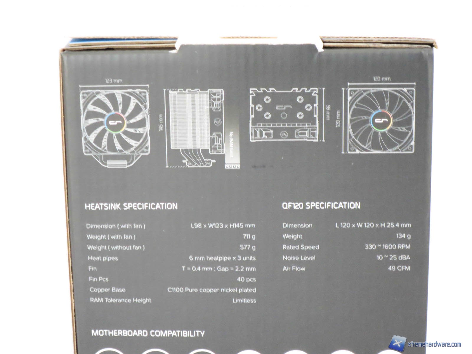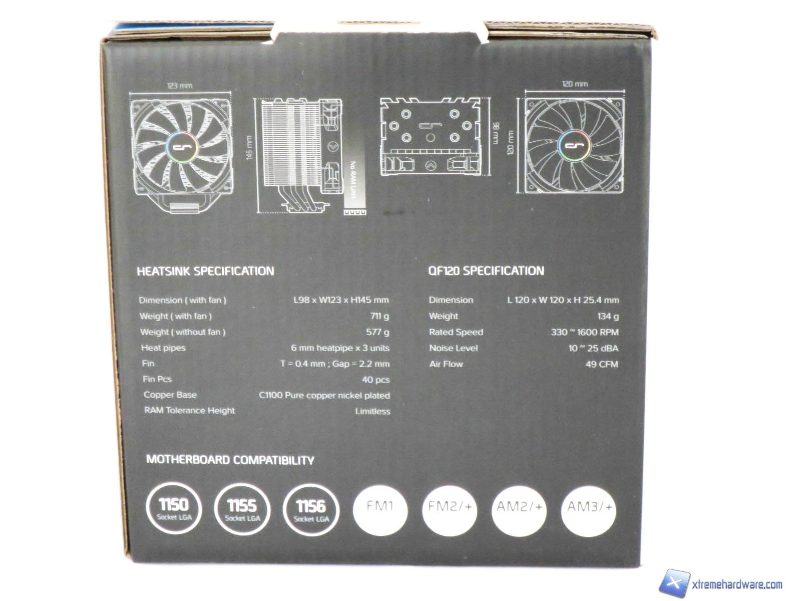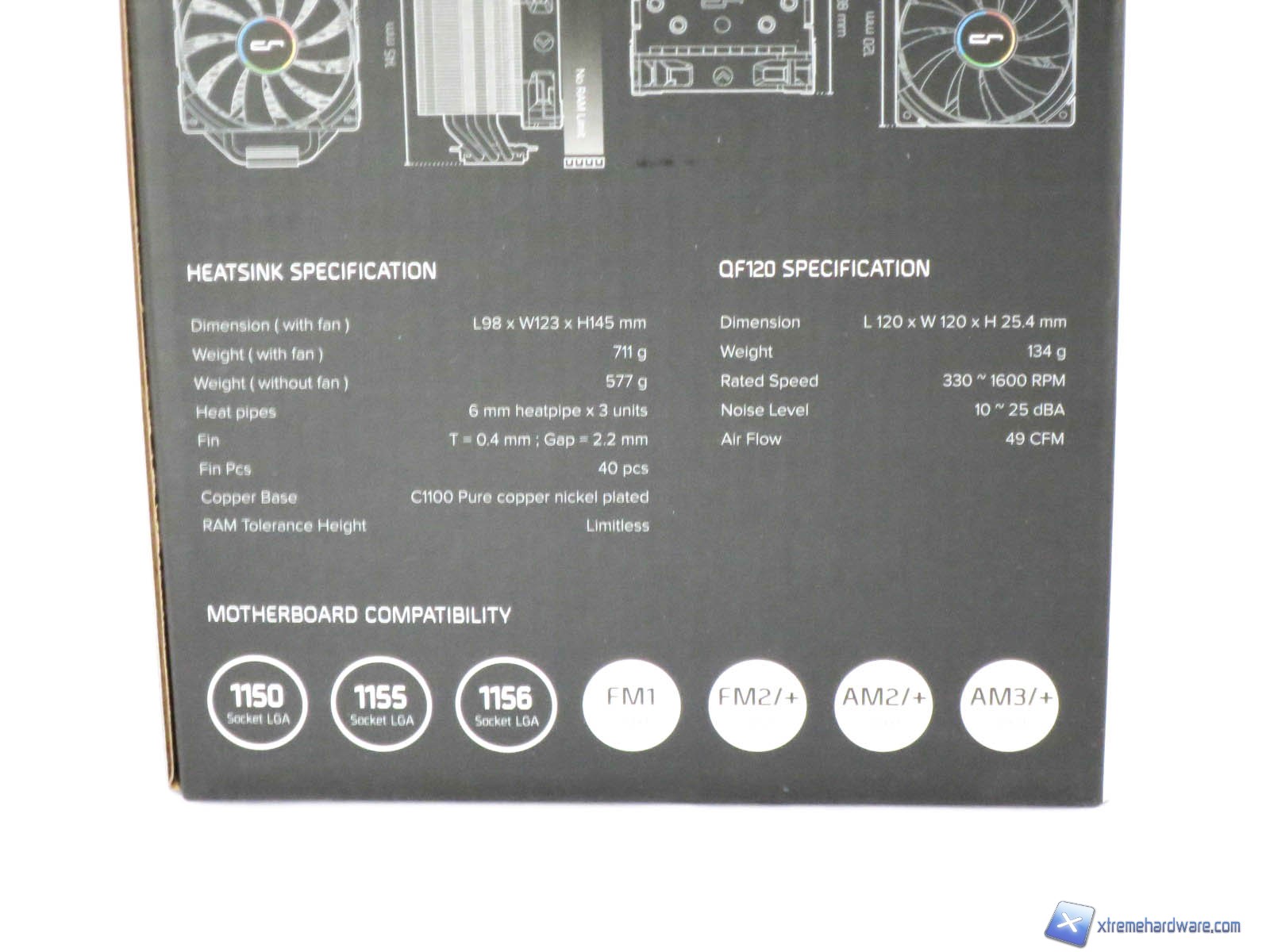 Nel retro troviamo i socket compatibili, le dimensioni del dissipatore e le specifiche tecniche del dissipatore e della relativa ventola.