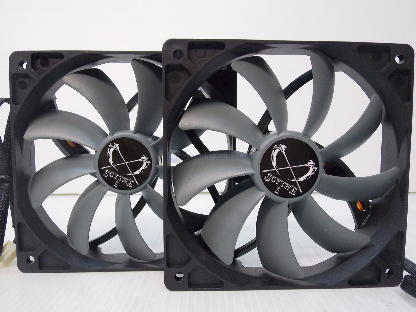 Le ventole in dotazione sono di buona qualità, però presentano un leggerissimo ticking ad RPM inferiori a 950, nulla di fastidioso comunque. In termini di performance sono perfettamente adatte al radiatore, stando ai nostri test comparativi con il modello di riferimento Noctua NF-F12.