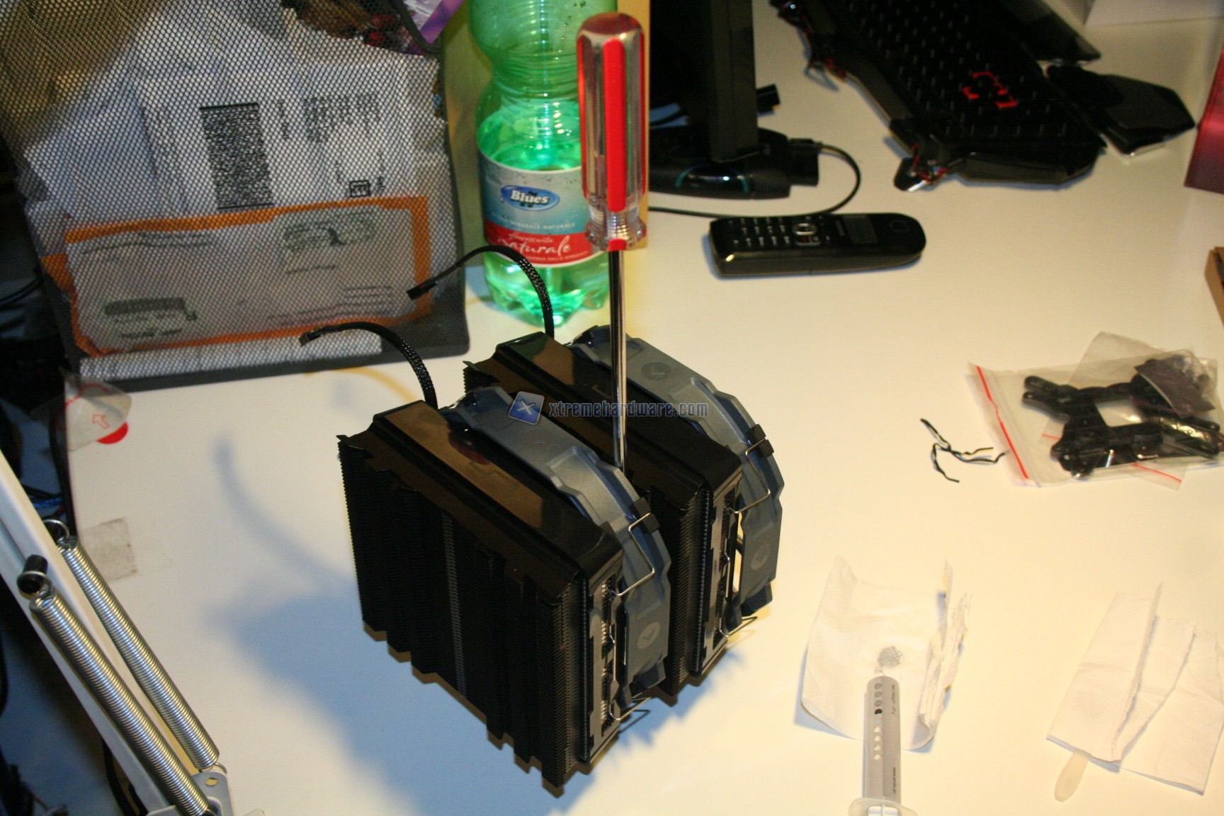 La procedura d’installazione, in questo caso inerente a sistemi Intel, è davvero veloce; il sistema di montaggio infatti aiuta moltissimo poiché sarà addirittura possibile fissarlo verticalmente con le ventole già installate. Di solito è necessario rimuoverle, in questo caso invece è possibile utilizzare un cacciavite a croce lungo 30cm (consigliatissimo per l’installazione dei dissipatori) in quanto sono presenti delle rientranze che combaciano con gli innesti filettati sulla base. Eccezionale !