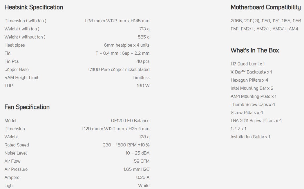 A seguire riportiamo le specifiche del dissipatore Cryorig H7 Quad Lumi: