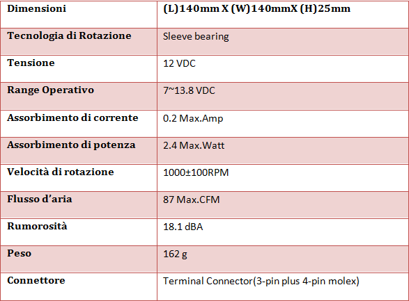 Prolimatech ha provveduto a fornirci anche una ventola  BLUE VORTEX da 140mm che con soli 17db riesce a raggiungere gli 87CFM di portata d'aria, e di seguito riportiamo nel dettaglio le sue caratteristiche: