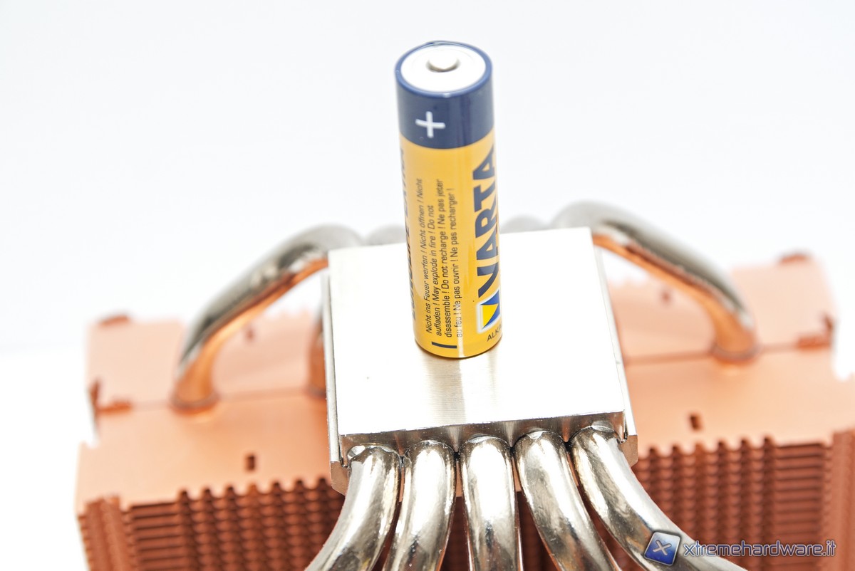 Ma iniziamo ad analizzare il PH-TC14PE dalla base. Realizzata in rame, con finitura al nickel, presenta una discreta lappatura, anche se non perfettamente a specchio. La qualità delle saldature è piuttosto buona ed esteticamente risulta ben rifinito. Particolarità delle saldature è una nuova tecnologia chiamata Cold Plasma Spraying Coating Technology che, mediante il deposito omogeneo di particelle di rame sulla superficie di contatto delle heatpipe, migliora le proprietà di conduttività termica. Le 5 heatpipe in rame che si dipartono dalla base con struttura ad U, sono anch’esse nickelate, ed hanno un diametro di 8mm. A titolo comparativo, il Thermalright Silver Arrow, altro dissipatore a doppia torre di grande successo, ha heatpipe dello stesso diametro, ma il numero si limita a 4. Le heatipipe si diramano all’interno dei due corpi disponendosi linearmente, in modo da distribuire il calore in modo omogeneo.