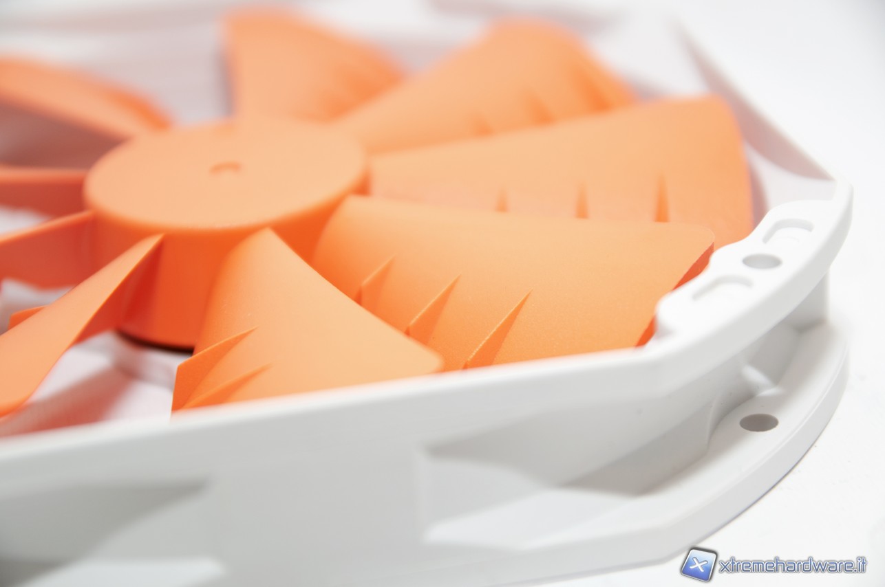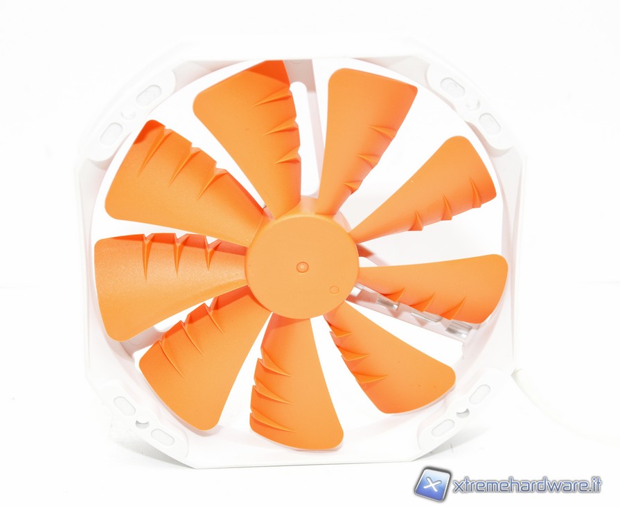 Il dissipatore PH-TC14PE è equipaggiato con due ventole da ben 140 mm di diametro. Le PH-F140 sono ventole molto particolari, realizzate da Phanteks per ottenere le massime prestazioni da questo dissipatore. La scocca ha una forma quadrata ma presenta angoli smussati al fine di ridurre possibili incompatibilità con altri elementi all’interno del PC (in primis il dissipatore del nortbridge). Particolare il disegno delle 9 pale, le quali sfruttano la tecnologia Maelström Vortex Booster (MVB), un particolare accorgimento che possiamo notare sulla superficie delle pale al fine di ridurre i vortici ed aumentare le prestazioni. Notiamo non solo delle piccole pinne perpendicolari alla superficie della pala, ma anche dei piccoli intagli in corrispondenza della pinna stessa. Grazie a questi accorgimenti la PH-F140 consente di ottenere un flusso di 78CFM con soli 19dBA di rumore. La pressione statica, pari a 1.21 mmH2O, non è molto elevata, tuttavia il corpo dissipante che il flusso d’aria deve attraversare è relativamente poco spesso, e la configurazione a due ventole, estendibile con una terza nella parte posteriore, garantisce un flusso omogeneo su tutta la superficie dissipante. Delle strisce di gomma da interporre tra il dissipatore e la ventola contribuiscono a ridurre il rumore generato dalle vibrazioni.