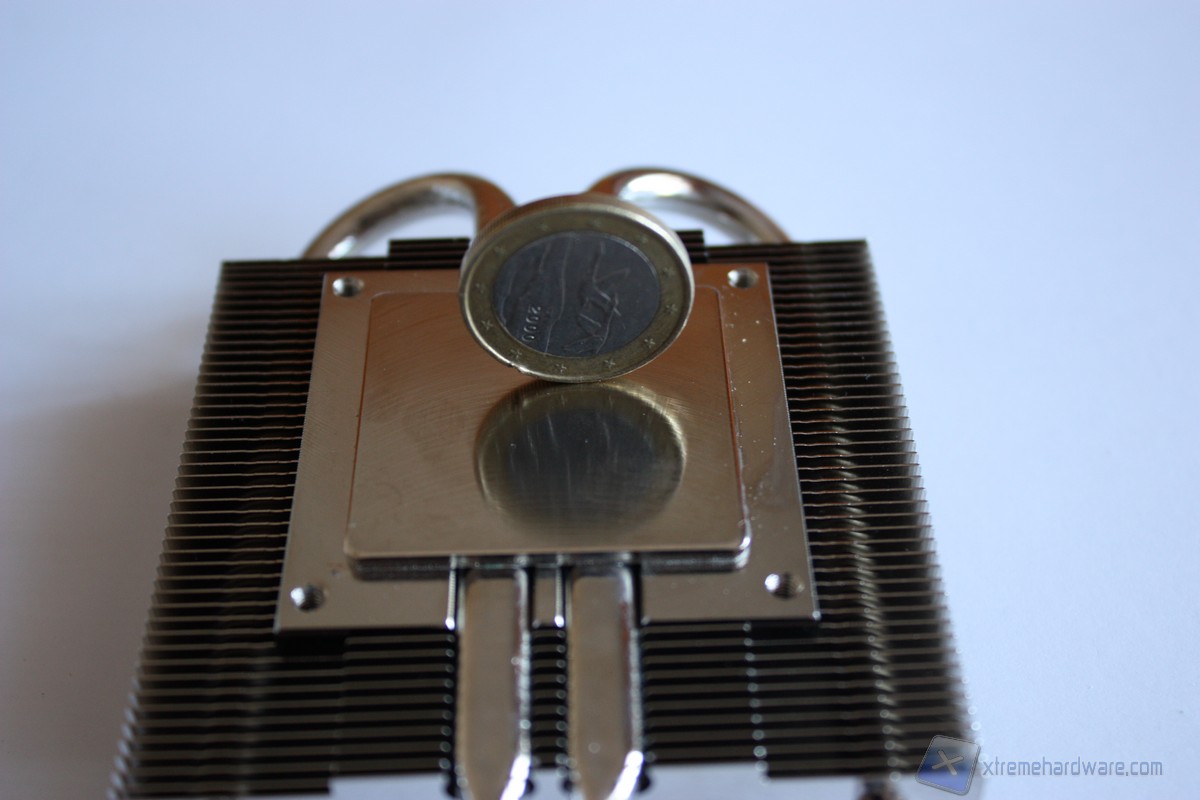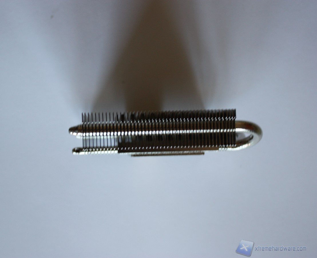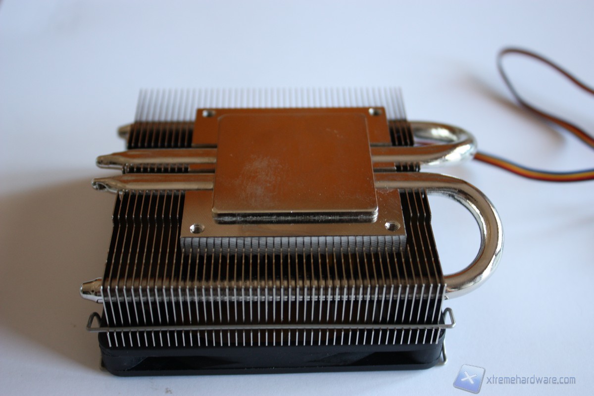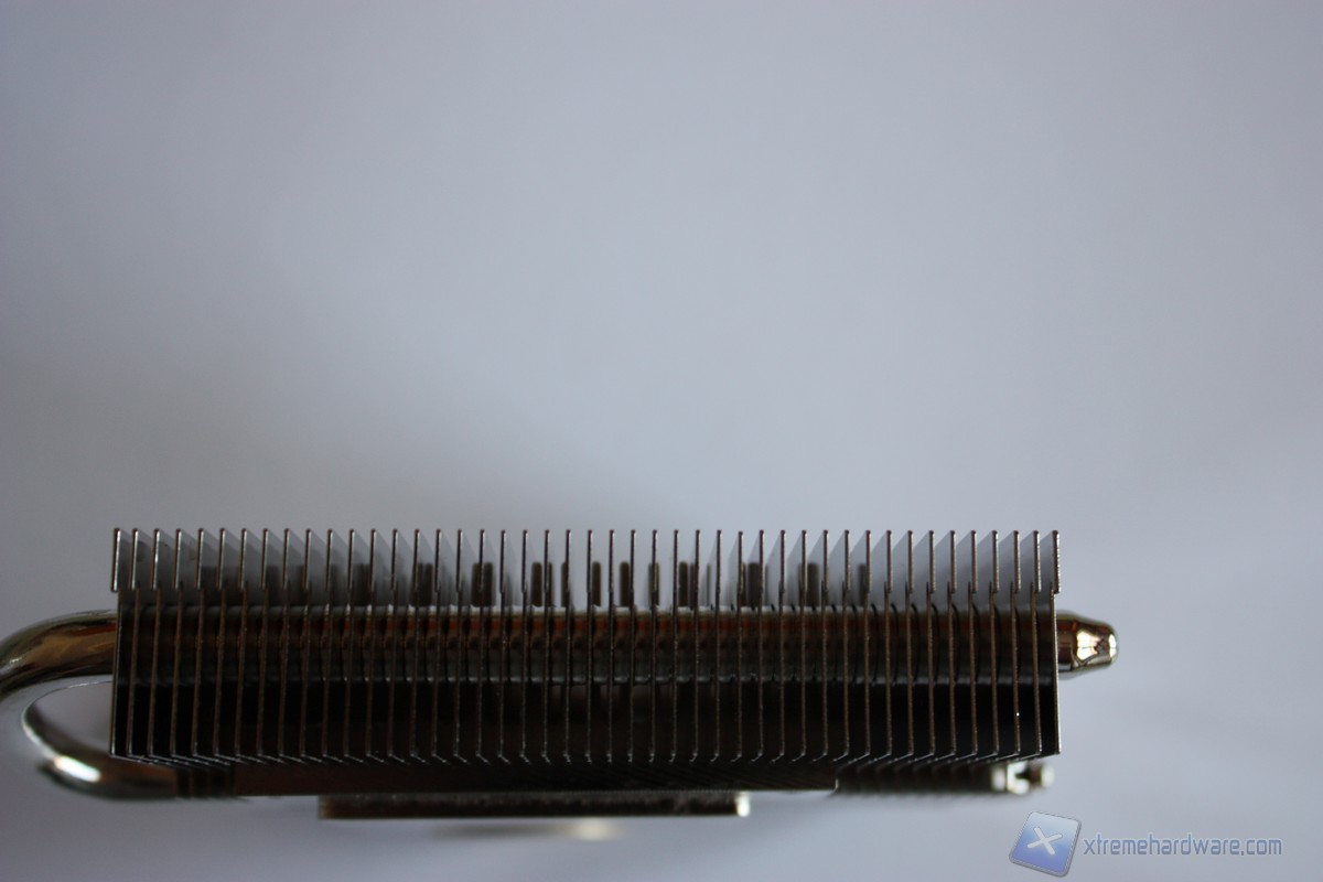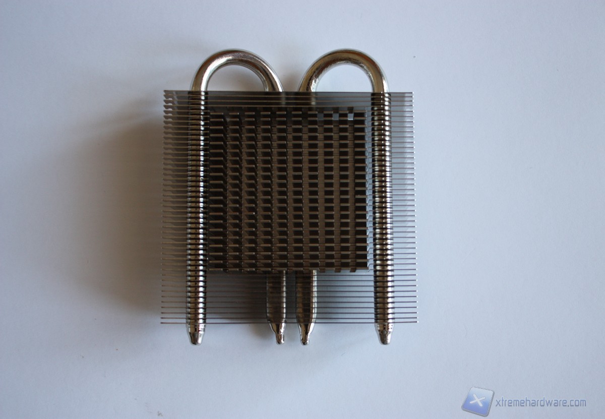 E' interessante notare come sopra alla base di contatto con la CPU sia presente un dissipatore passivo più massiccio, atto a favorire uno scambio diretto del calore. Le due heatpipe tendono invece a distribuire il calore nella zona esterna del dissipatore, massimizzando l'efficienza della piccola superficie dissipante.