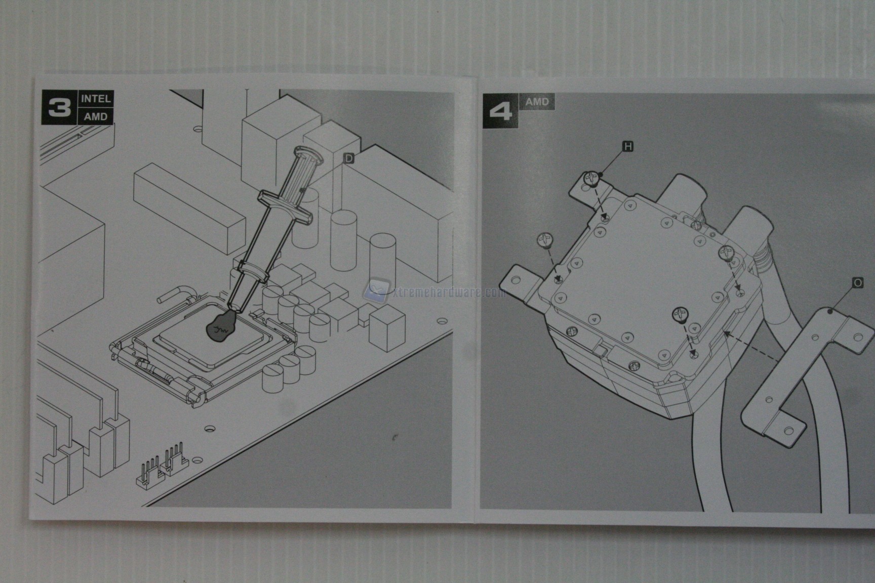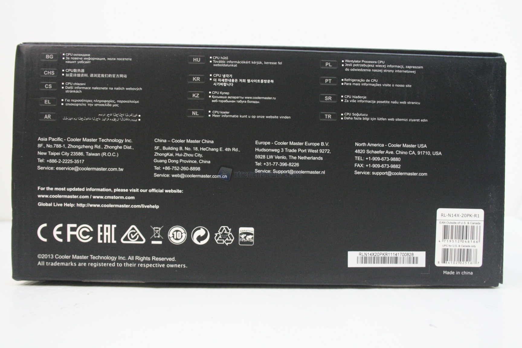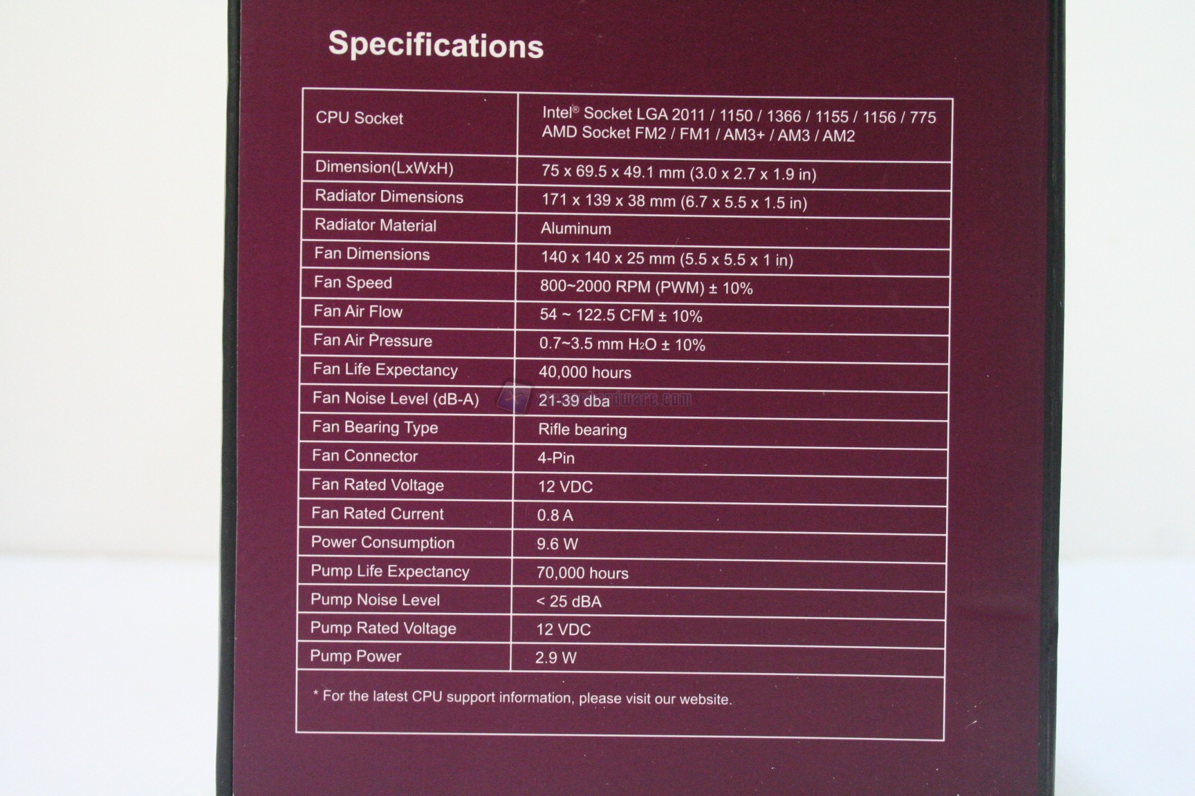Il dissipatore è inserito all’interno di una classica, e notevole, confezione Cooler Master. Il quantitativo di informazioni è elevato e l’imballo decisamente valido, data anche la confezione di generose dimensioni. Il confezionamento interno è derivante da sostanze riciclate, similmente a soluzioni della concorrenza e similmente ai prodotti immessi da CoolIt ed Asetek. Ciò rende possibile ovviare in parte ai seri problemi derivanti dagli imballi di prodotti informatici, che per la loro natura inquinante sono problematici nello smaltimento. Una volta aperta la confezione però è presente un sottile strato di polietilene espanso (PET). La scatola, di forma rettangolare, è molto rigida, ed all’esterno vengono riportate le tolleranze laterali e i dettagli dimensionali, aspetto interessante dato che non è prassi comune. Il manuale in dotazione, altro non è che un gigantesco foglio con i dettagli di installazione. Avremmo gradito un manuale classico ma per ragioni di costo probabilmente non si è scelto di optare per tale soluzione; comunque sia è curato e adatto allo scopo.
