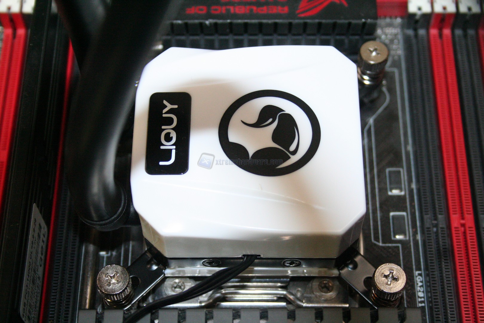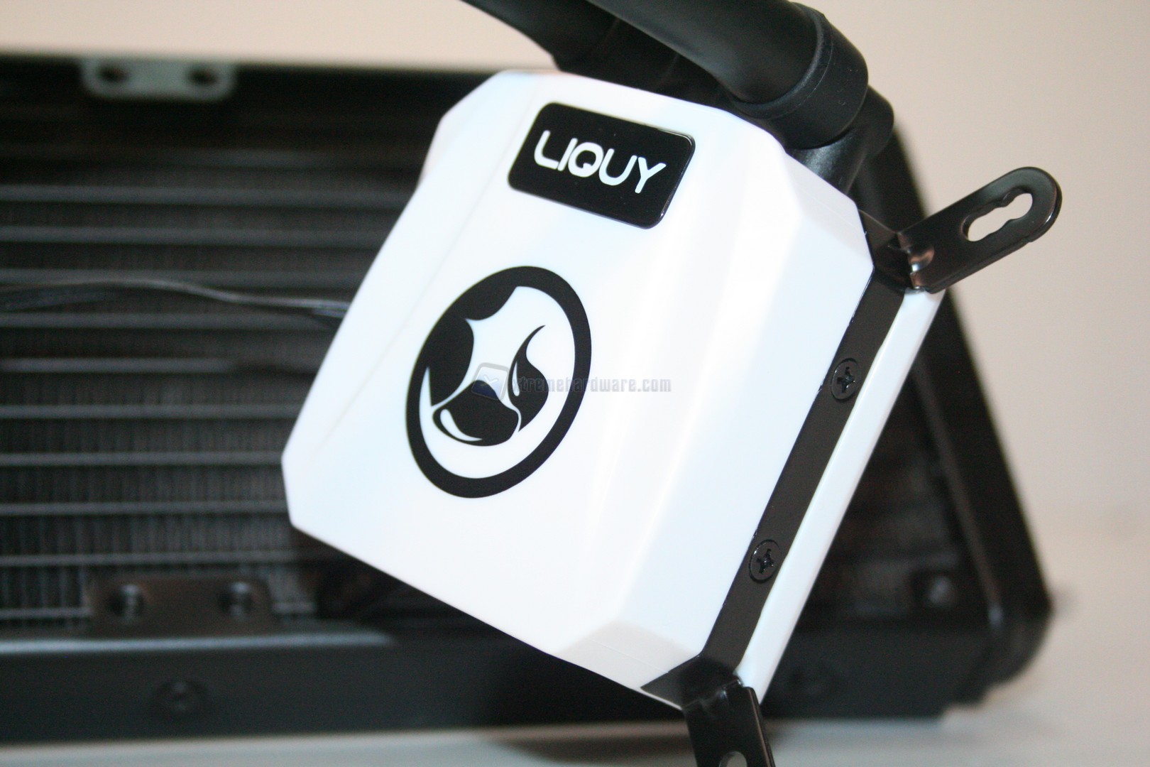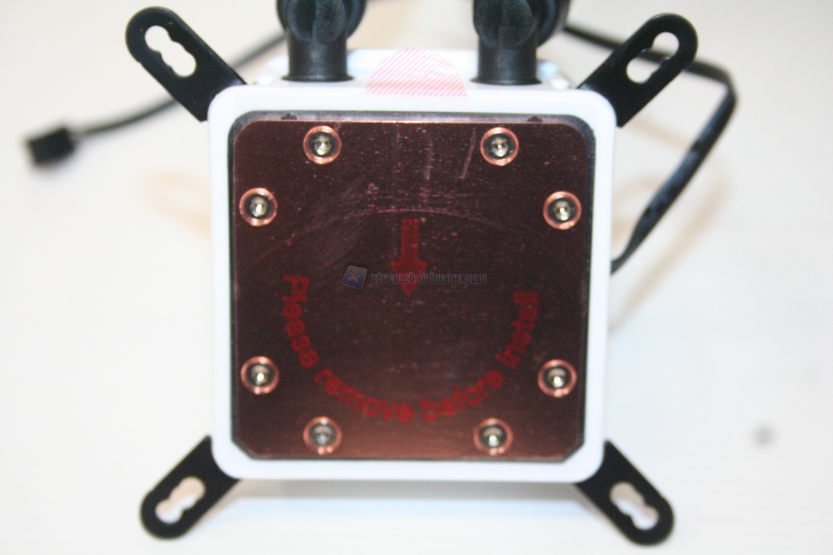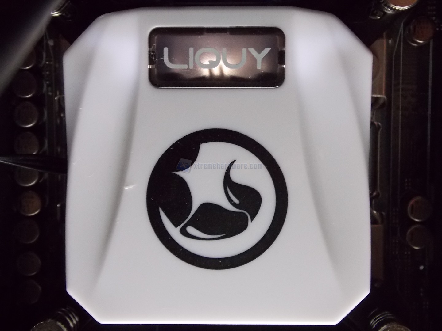 La base non presenta della pasta termica preapplicata, fortunatamente, e si caratterizza per essere della medesima tipologia delle soluzioni Asetek di passata generazione. Non è un difetto poiché la qualità complessiva, in termini di performance e montaggio, è ottima. Pezzo unico e lavorato al tornio; l'uso di questo strumento è decisamente evidente ma d'altronde permette una valida levigazione, sebbene nel caso di basi di AIO non ci sia lappatura a specchio. Il waterblock presenta un frame in plastica quadrato, con una porzione superiore circolare recante il logo del produttore, anche se giudicando dal logo LIQUY in rilievo con i LED sottostanti accesi, si poteva certamente fare di meglio: