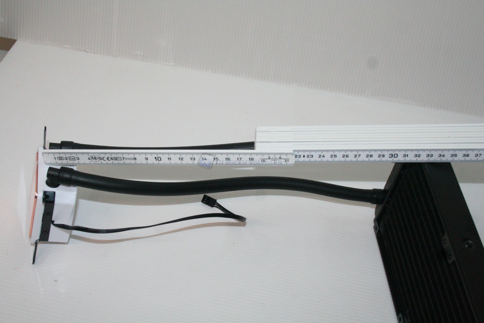 La tipologia delle tubazioni semra essere quasi identica ai vecchi modelli Corsair H100i, con qualche elemento più solido nella giunzione radiatore e tubazioni. Sono quindi robuste ma non eccessivamente rigide; non ci sarà il minimo problema di collasso o ripiegamento netto della guaina. La lunghezza delle tubazioni è modesta, ragion per cui sarebbe consigliabile montarlo nel classico posizionamento verticale in una conformazione ATX, ovvero con il radiatore a contatto con la parte superiore del telaio del case, con le ventole in esplusione. Il diametro dei tubi, reale, è leggermente inferiore a quello che potete osservare direttamente all’esterno, anche se diversamente dalle classiche tipologie di tubi FEP, sembrerebbe non esserci nessun problema per quanto concerne una forte resistenza laterale del fluido interno, contro le insenature radiali del tubo stesso. Sarebbe necessario segarlo in due, e si comprende chiaramente che ciò non è ovviamente possibile ai fini della recensione.