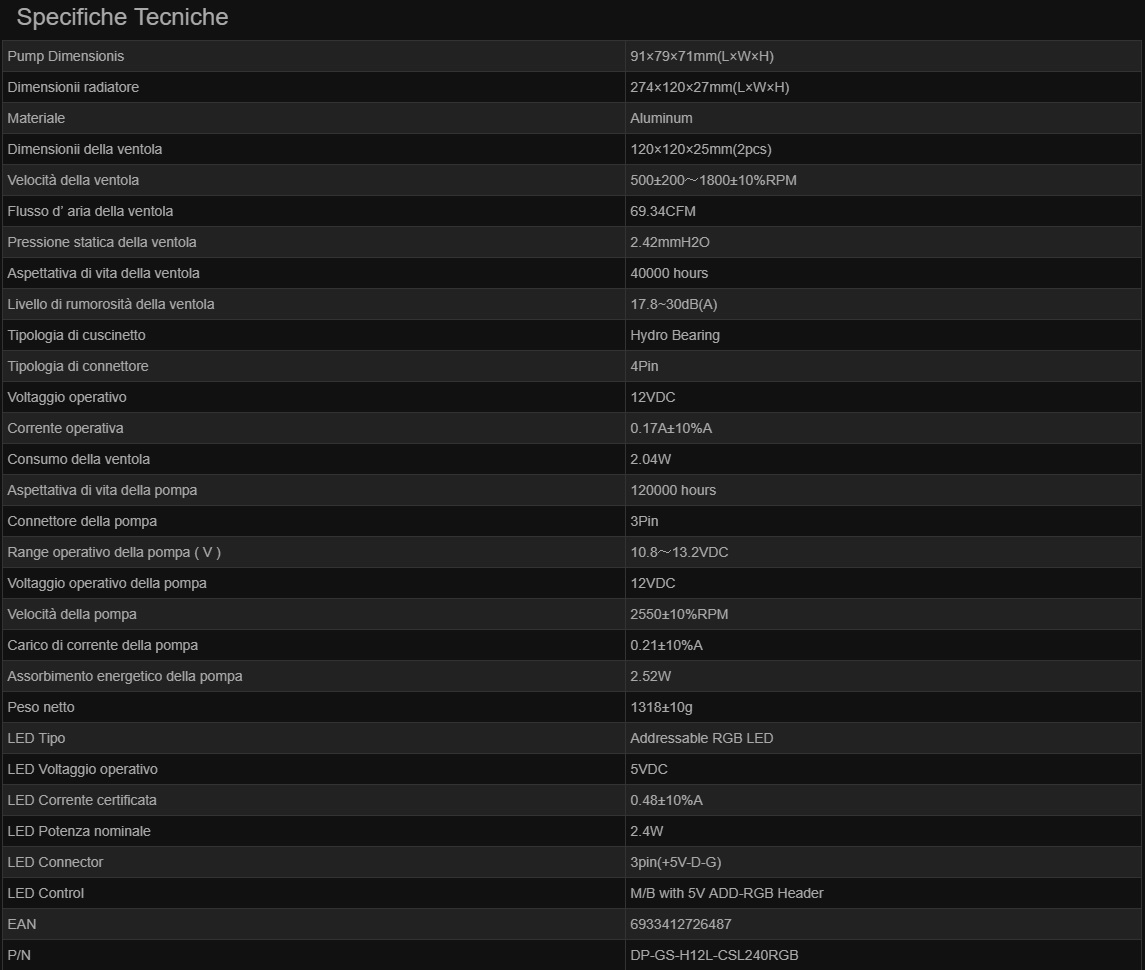A seguire riportiamo le specifiche del dissipatore Deepcool Gamerstorm Castle 240 RGB: