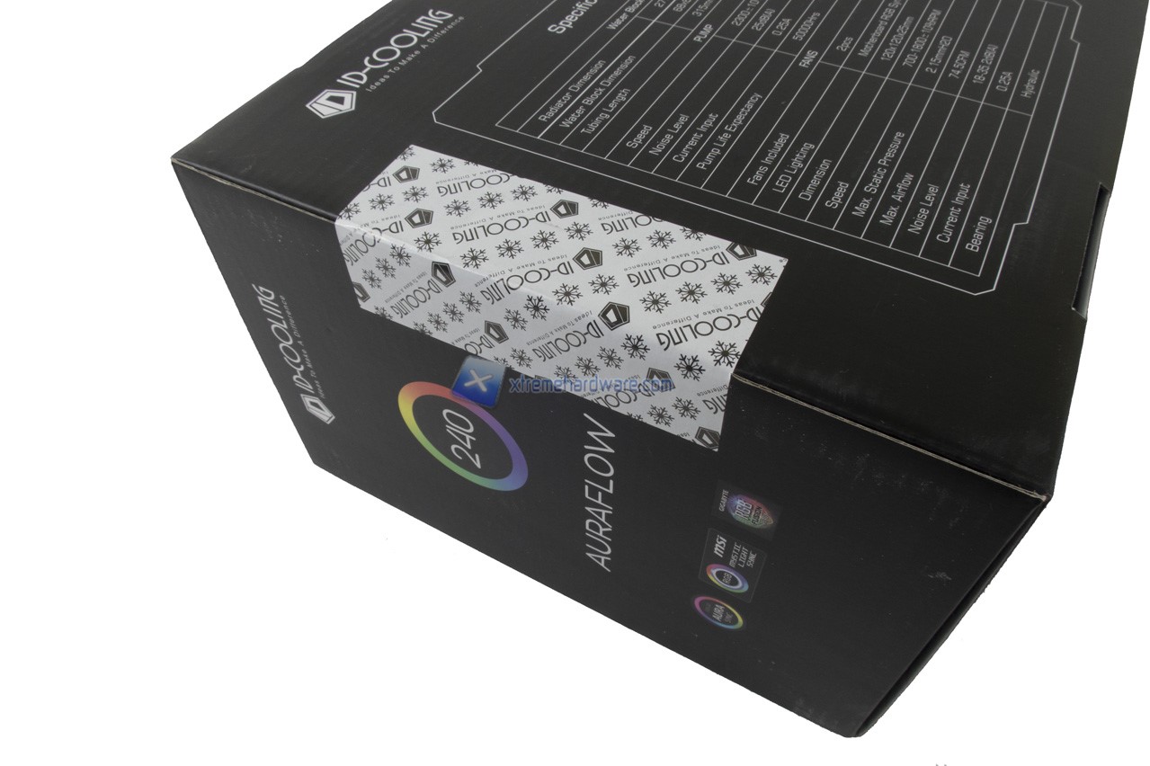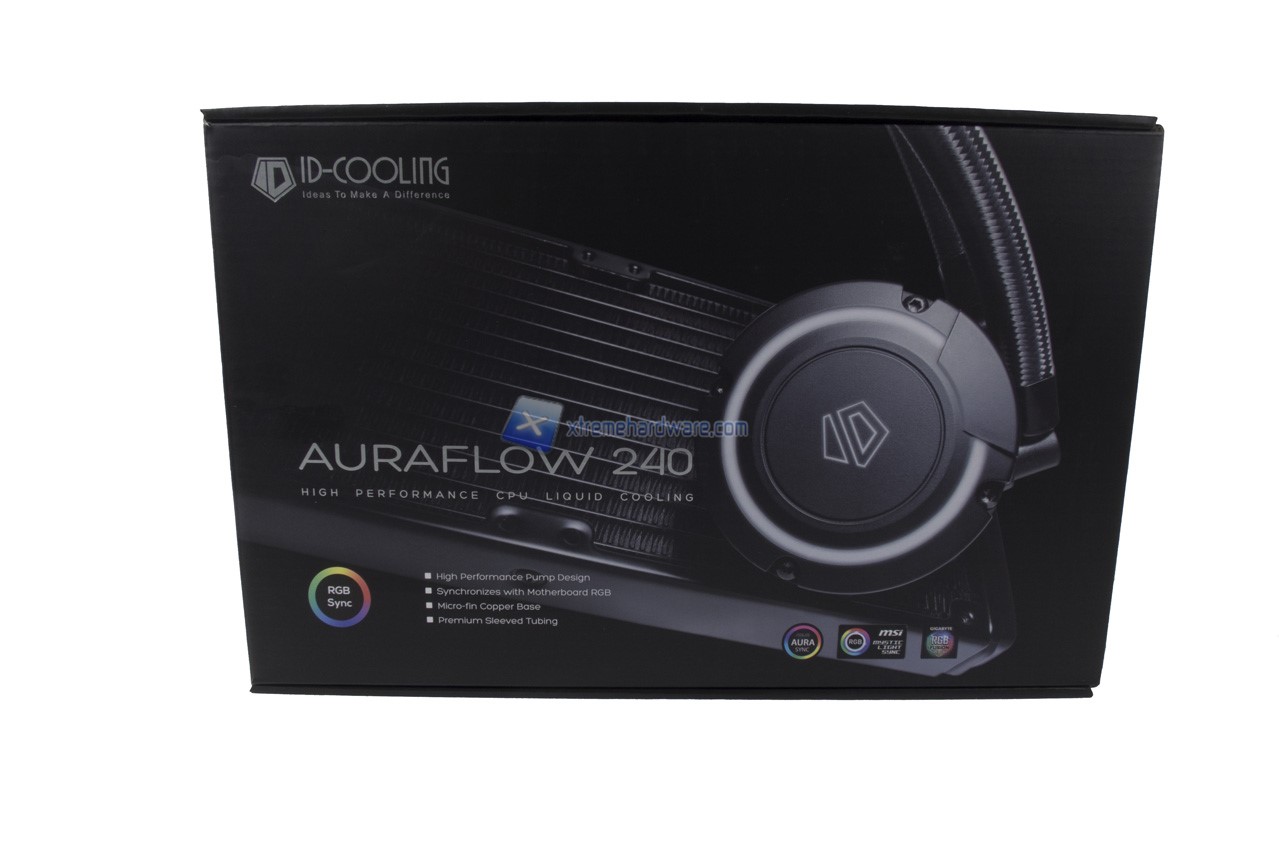 L’ID-Cooling Auraflow 240 arriva in una classica e comune confezione di cartone sulla quale vengono riportate tutte le principali informazioni e immagini del prodotto.