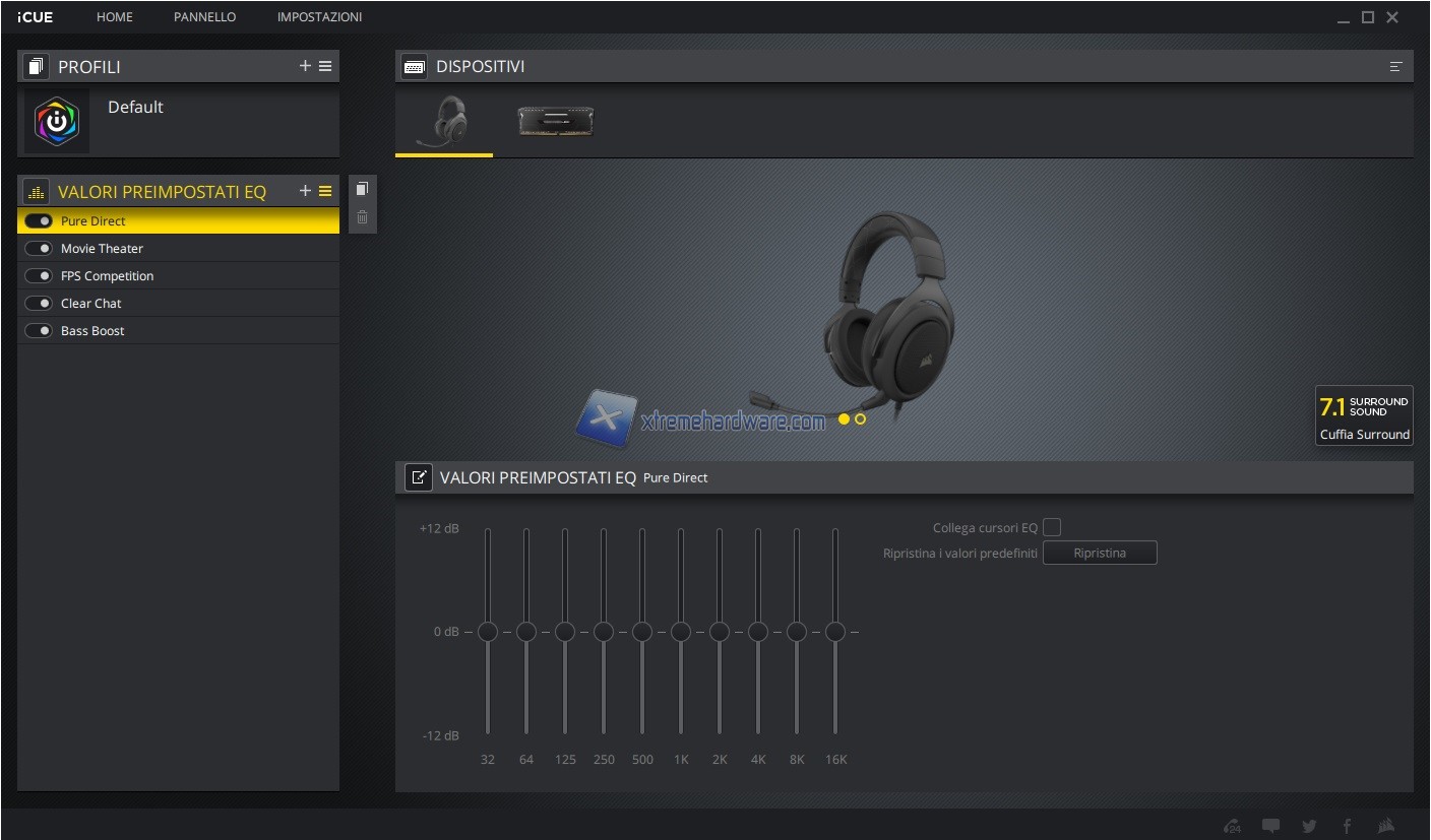 In questo capitolo invece vi riportiamo tutte le immagini relative l’ormai conosciuto e famoso software di gestione di periferiche e componenti Corsair iCUE. Software sicuramente molto completo e a mio avviso molto intuitivo. Tramite il software, in questo caso, potremo agire solo sui Presets attivi e/o regolazione dell’equalizzatore e attivare o meno il suono 7.1 Surround. Non essendo cuffie dotate di illuminazione RGB non troveremo alcuna voce Extra.