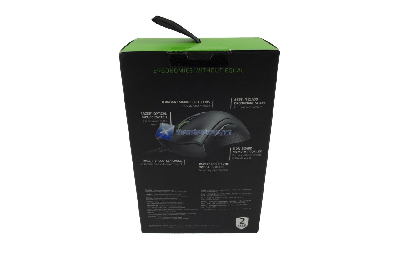 Passiamo dunque alla confezione. Packaging classico per i prodotti Razer. Colorazione Nera in contrasto al verde acido. Alcune immagini illustrative e diverse informazioni e caratteristiche tecniche ad identificare già i principali aspetti e punti salienti del modello V2.