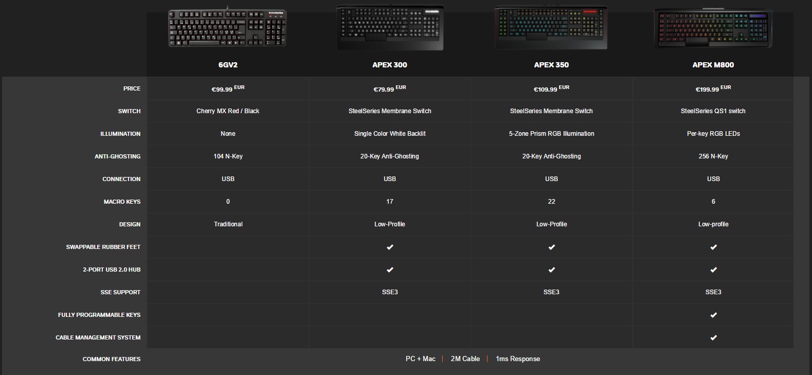Procediamo ad elencare brevemente le differenze della tastiera SteelSeries Apex M800 con altri modelli SteelSeries Apex più recenti e con il primo e forse intramontabile modello 6GV2 dotato interamente di switch Cherry MX: