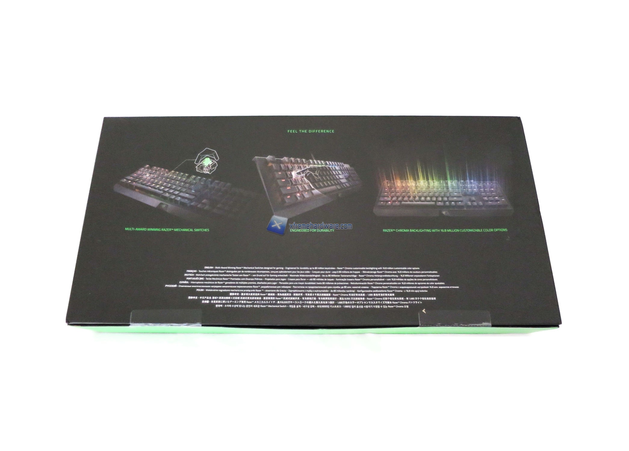 Nuova serie, nuovo packaging. La nuova Razer BlackWidow X Chroma ci giungerà sempre in una confezione di cartone con una grafica semplificata ma sempre molto caratteristica. Avremo anche la possibilità di cliccare alcuni tasti (freccette direzionali) prima dell’acquisto in modo da constatare se la tipologia di switch utilizzati sia ideale o meno per i nostri scopi e utilizzi. Nel retro della confezione troviamo poche altre informazioni e immagini.