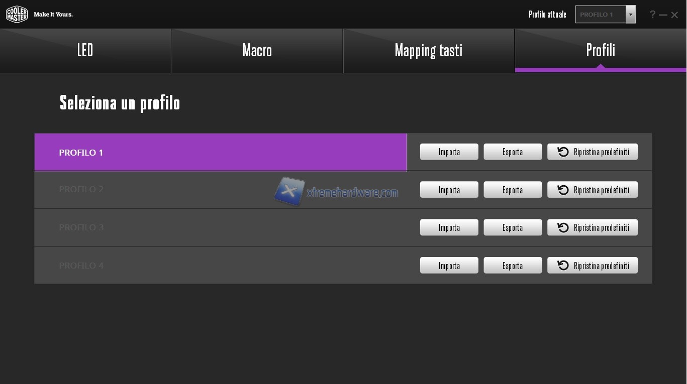 A seguire, avviando l’applicazione per la tastiera troviamo nella parte alta i Menù principali che sono ‘LED’’, ‘’Macro’’, ‘’Mapping Tasti’’ e infine ‘’Profili’’ per un totale di 4 Profili.