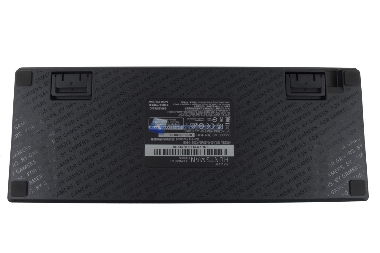 Capovolgendola possiamo osservare la parte inferiore con un design anche qui rinnovato. La superficie dello chassis inferiore in plastica è totalmente serigrafato dallo slogan classico di Razer. L’effetto è mio avviso super. Ai quattro angoli notiamo i piedini in gomma di forma quadrata che eviteranno qualsiasi movimento della tastiera sul piano d’appoggio.