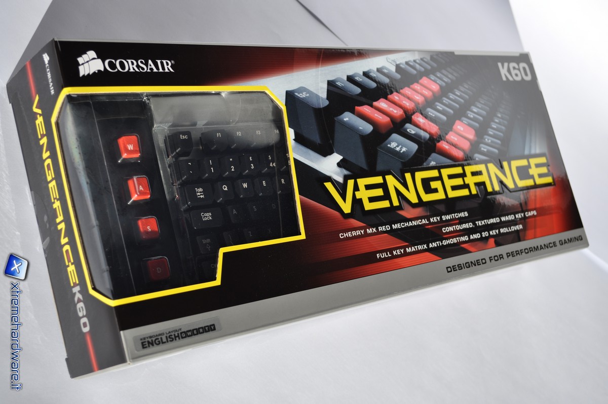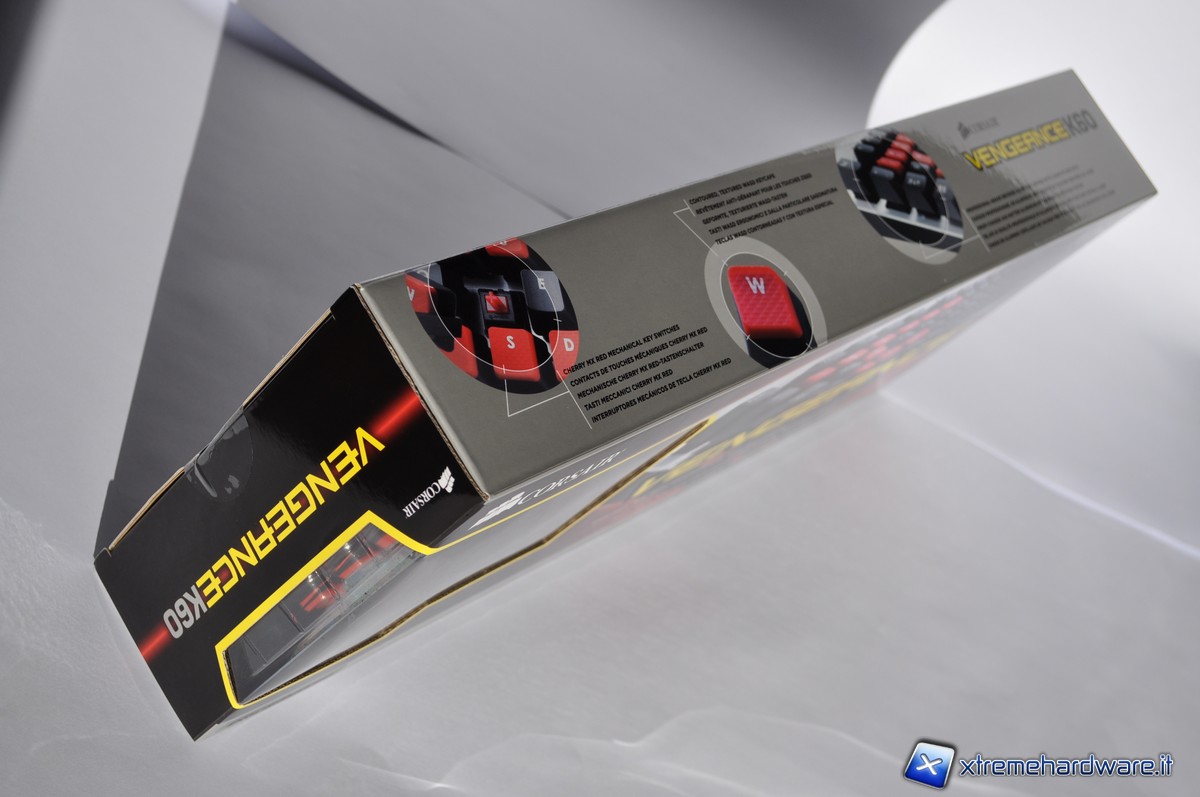 La scatola che racchiude la tastiera Vengeance K60 presenta una grafica molto curata e accattivante. Poiché il target di questo prodotto sono i gamer, nel reparto marketing di casa Corsair hanno ben pensato di utilizzare come colori principali il rosso, il nero e il giallo in maniera tale da esprimere l’idea di aggressività che accompagna questa periferica altamente specializzata. Oltre alla scritta a caratteri cubitali “Vengeance”, l’altro dettaglio che salta subito all’occhio sul lato frontale è l’area trasparente che mette in bella mostra il proprio prezioso contenuto. Subito l’occhio cade sui tasti rossi WASD a fianco della tastiera vera e propria.