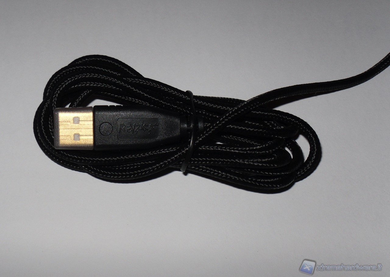 Il cavo, come accade tipicamente nei prodotti da gaming di fascia alta, è in treccia e terminato da un connettore placcato oro, protetto da un tappo in materiale plastico trasparente.