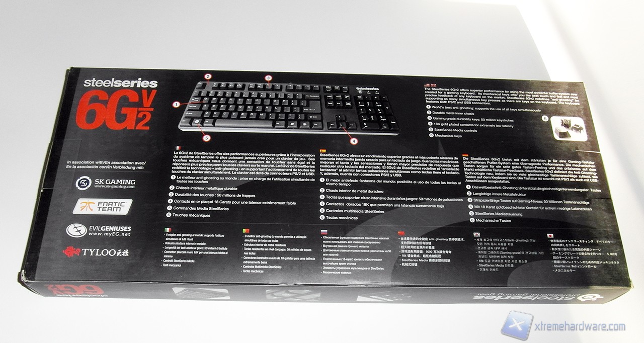 La parte inferiore si rileva molto più interessante in quanto riporta le varie caratteristiche e specifiche del modello in varie lingue, compreso l’italiano. È presente la possibilità di un utilizzo simultaneo di tutti i tasti mediante connessione PS/2, la presenza di una struttura interna completamente metallica, tasti meccanici con un ciclo di vita di 50 milioni di battute e inoltre viene menzionata la presenza di tasti multimediali attuabili tramite tasto SteelSeries. Oltre a queste caratteristiche vengono citati alcuni Team Pro-gaming come Fnatic Team e SK Gaming.