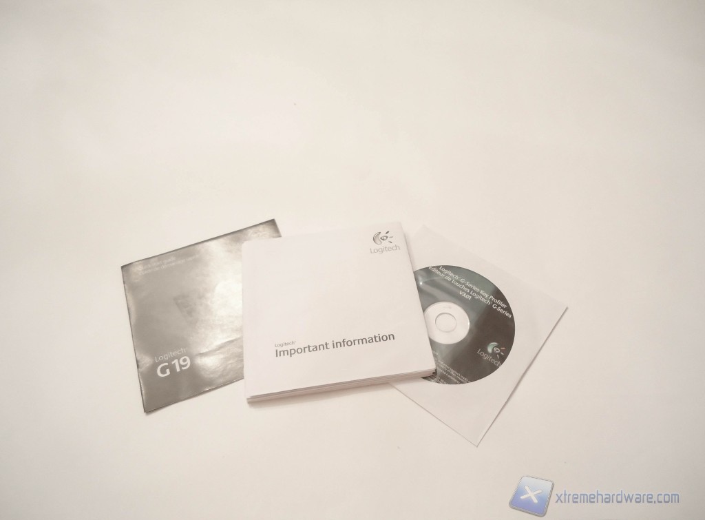 Aprendo la confezione in primo piano troviamo la G19 racchiusa in un involucro di plastica per proteggerla dai graffi. Negli angoli superiori della scatola troviamo due piccoli scompartimenti di cartone dove sono alloggiati rispettivamente alimentatore e cavo USB della tastiera.