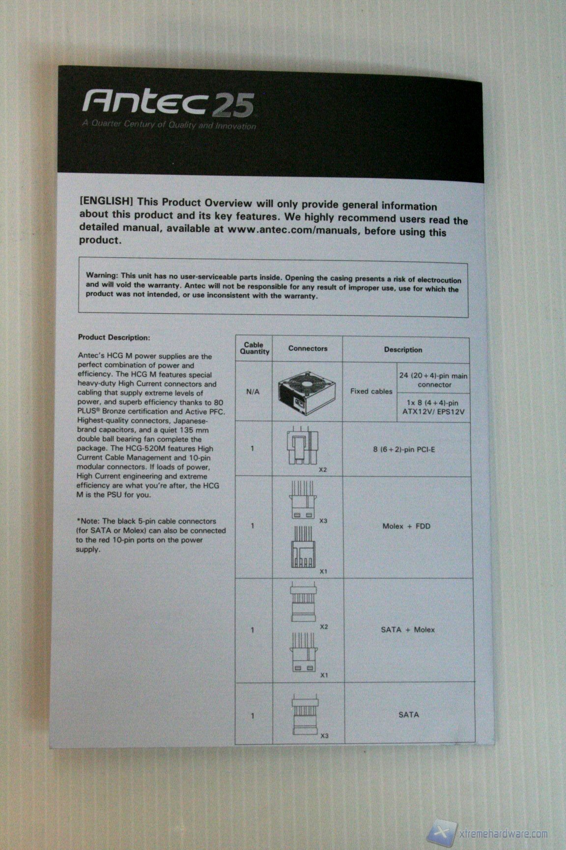Non ci dilunghiamo molto sulla confezione esterna in quanto le immagini sono particolarmente esplicative; ad ogni modo facciamo presente che il numero delle informazioni, per un prodotto simile, è decisamente sopra la media, come da consuetudine Antec. L’imballo è più che soddisfacente e l’organizzazione interna ottima, similmente all’altro alimentatore HCP-850. Vi mostriamo le foto dirette: