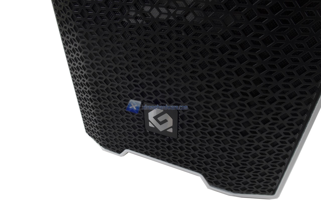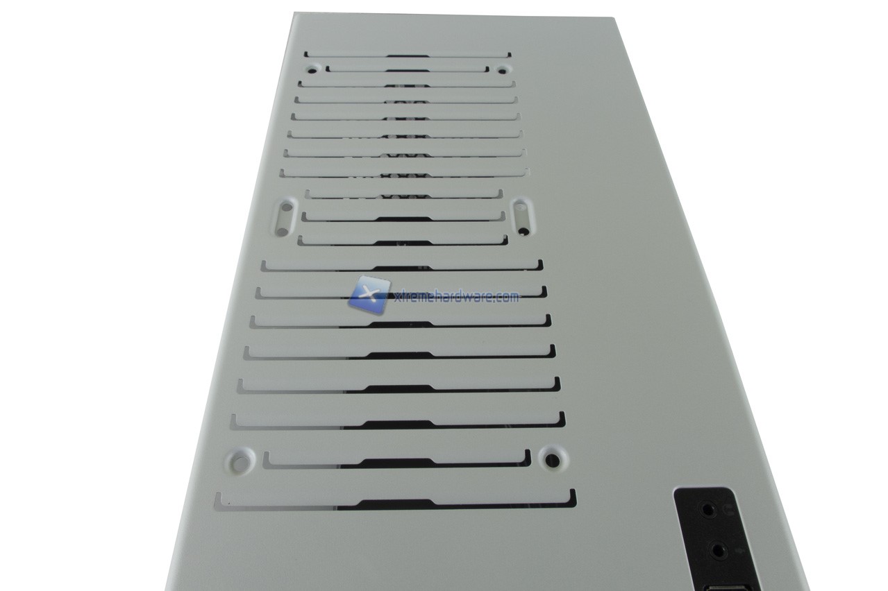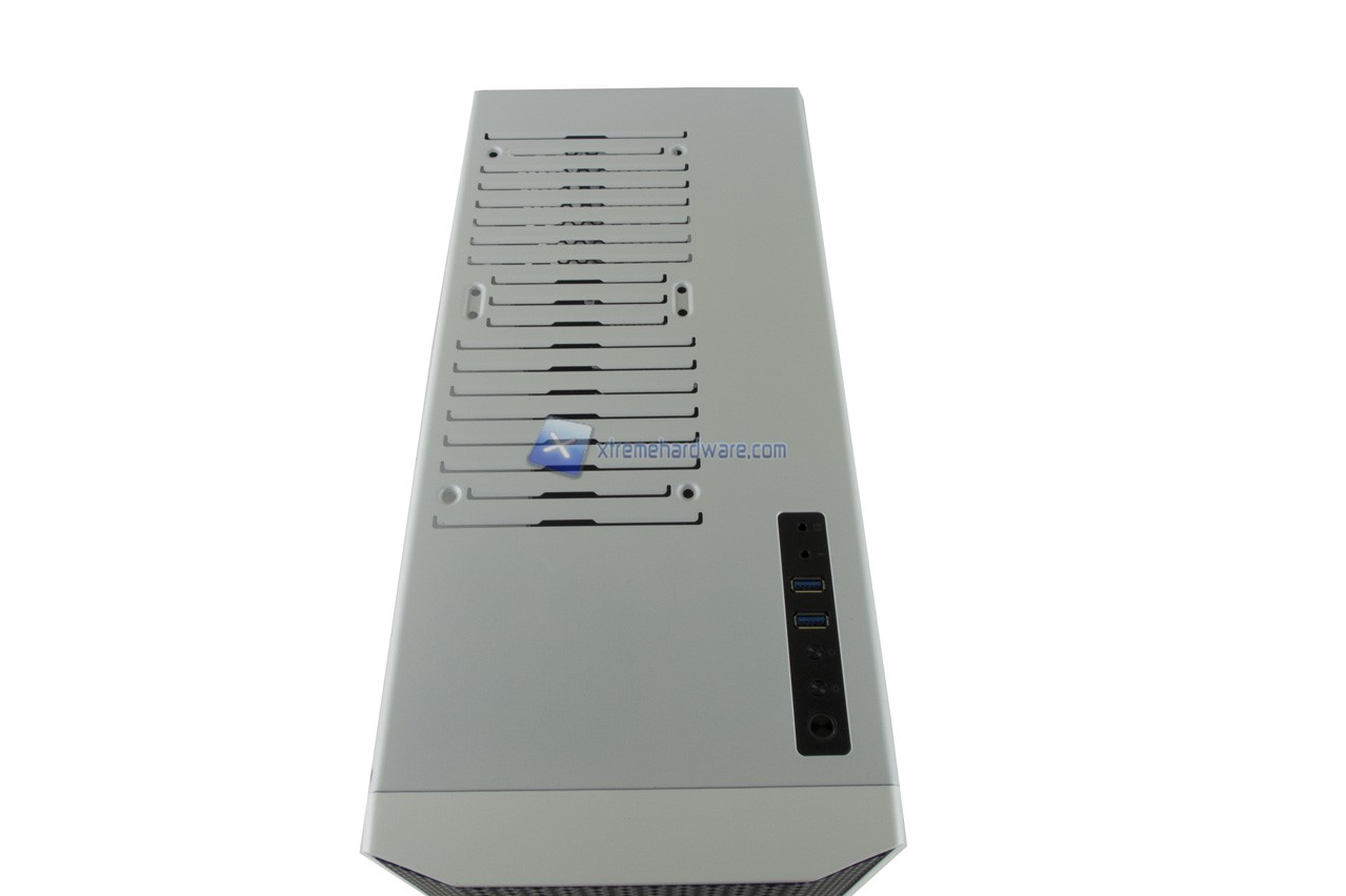 Si passa così al Top dove notiamo immediatamente un pannello chiuso eccetto la doppia griglia che permetterà di installare due ventole da 120 mm o due da 140 mm o solo un radiatore di pari dimensione. Lo spazio interno è esiguo quindi potremo installare solo ventole e non la classica combo radiatore e ventole che però sarà possibile frontalmente come ormai standard di molti case in commercio.