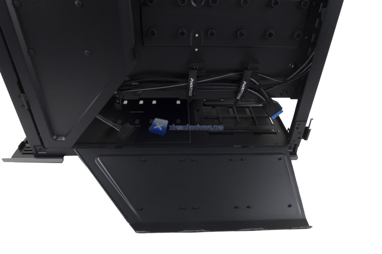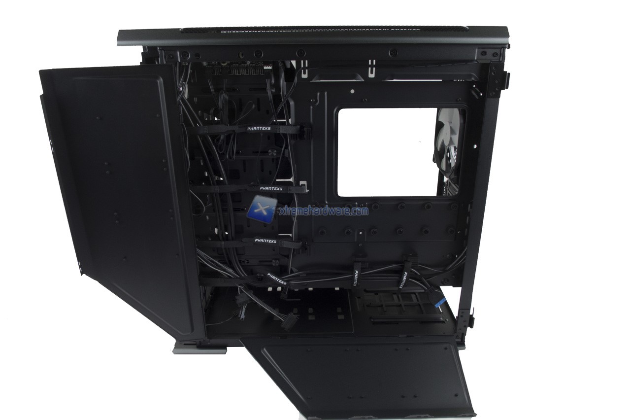 Il tray della scheda madre davvero robusto e solido è caratterizzato come solito da un generoso foro centrale che ci aiuterà a installare dissipatori ad aria o AIO anche in un secondo momento. Intorno il tray troviamo diversi fori per il passaggio e cablaggio dei cavi da e verso il PSU. Nel lato destro troviamo dei fori che saranno occultati da supporti scorrevoli in plastica con l’immancabile logo Phanteks. Dettagli e cura per i dettagli che non mancano come solito.