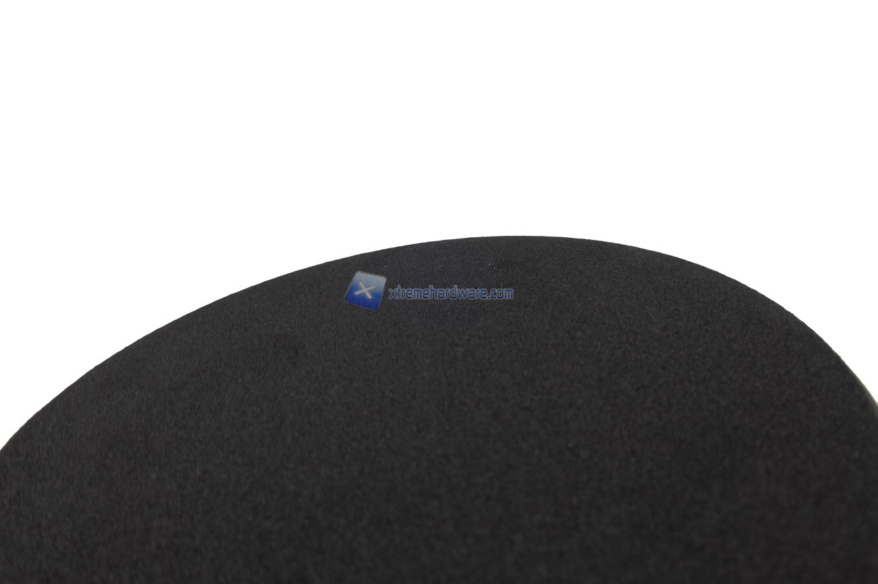 Il lato inferiore mostra solito un adesivo con tutte le principali informazioni, il foro/supporto per la base, un ingresso jack 3,5 mm per cuffie in modo da fare un test per regolazione volume di come si sentirà successivamente e infine l’ingresso Micro-USB per il collegamento del microfono al PC.