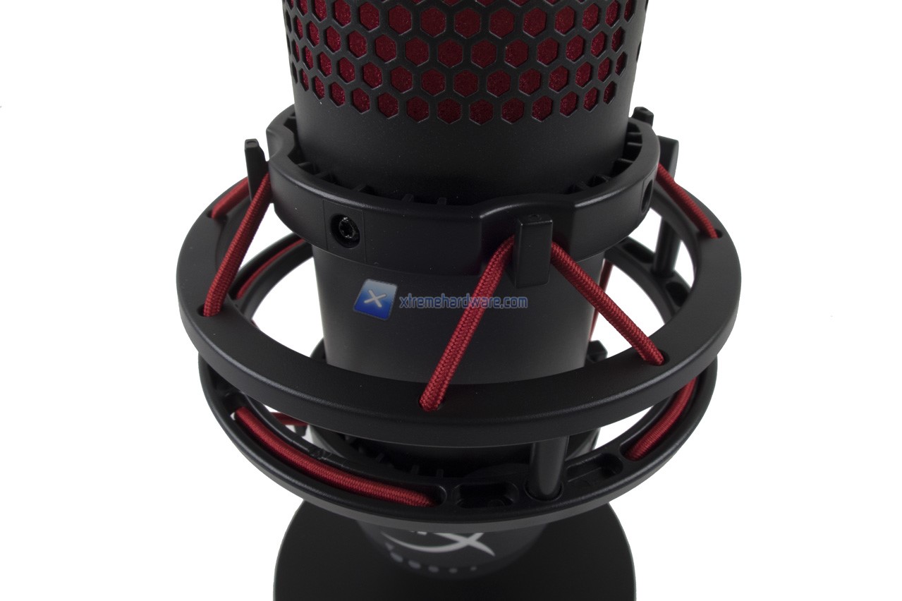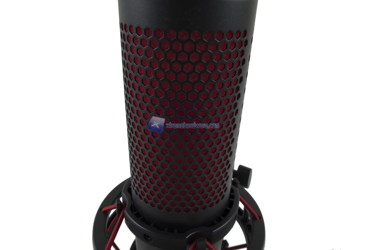 Osservandolo più da vicino possiamo notare la struttura superiore in metallo aperta con una trama a nido d’ape. Si nota grazie alla colorazione rossa il filtro antipop già integrato che andrà a ridurre/sopprimere la maggioranza di rumore e uniformare la nostra voce. Questa zona sarà illuminata, grazie ad un LED posto sempre all’interno, di colore rosso.