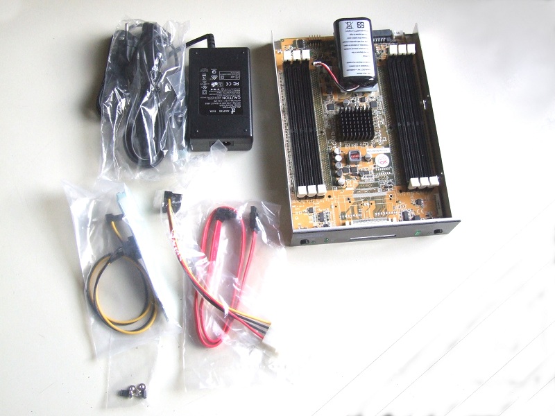 Sulla scheda logica troviamo 6 slot per altrettante RAM, per cui potremmo ottenere, ad esempio, un disco di 24Gb con l'uso di banchi da 4Gb. C'è anche una batteria al litio con tensione 7,4v e capacità 2400mAh, con l'importante compito di tenere in tensione le ram durante i black-out, scongiurando le perdite di dati a cui la RAM è soggetta per sua natura. Un pulsantino vicino alla batteria serve per il reset del disco (toglie sostanzialmente corrente alle ram per un breve periodo, similmente al tasto di clear cmos presente sulle nostre motherboard). Infine, al pannello frontale si affaccia un lettore di schede CF necessario per il backup automatico del disco, incorniciato tra i led di carica della batteria e i led e tasti di comando della funzione backup.