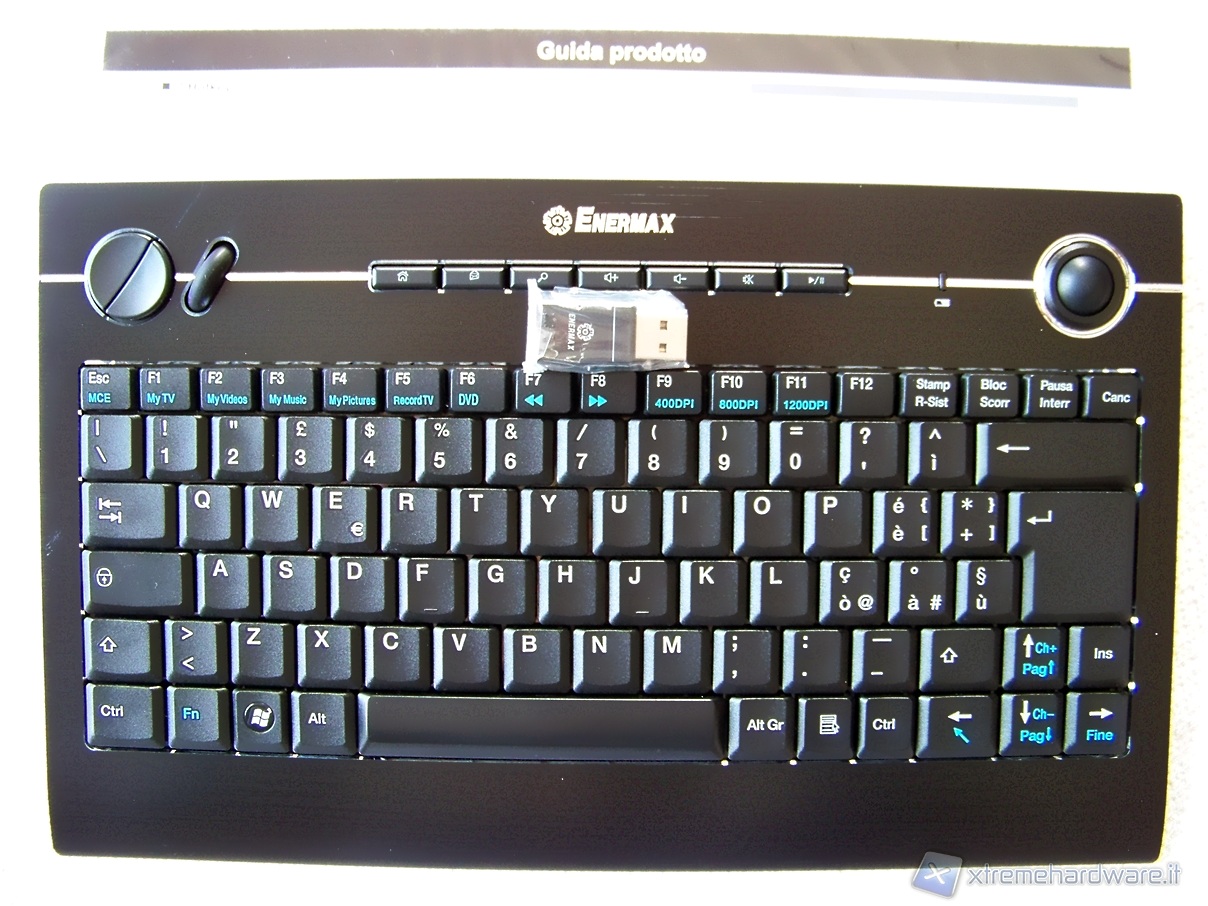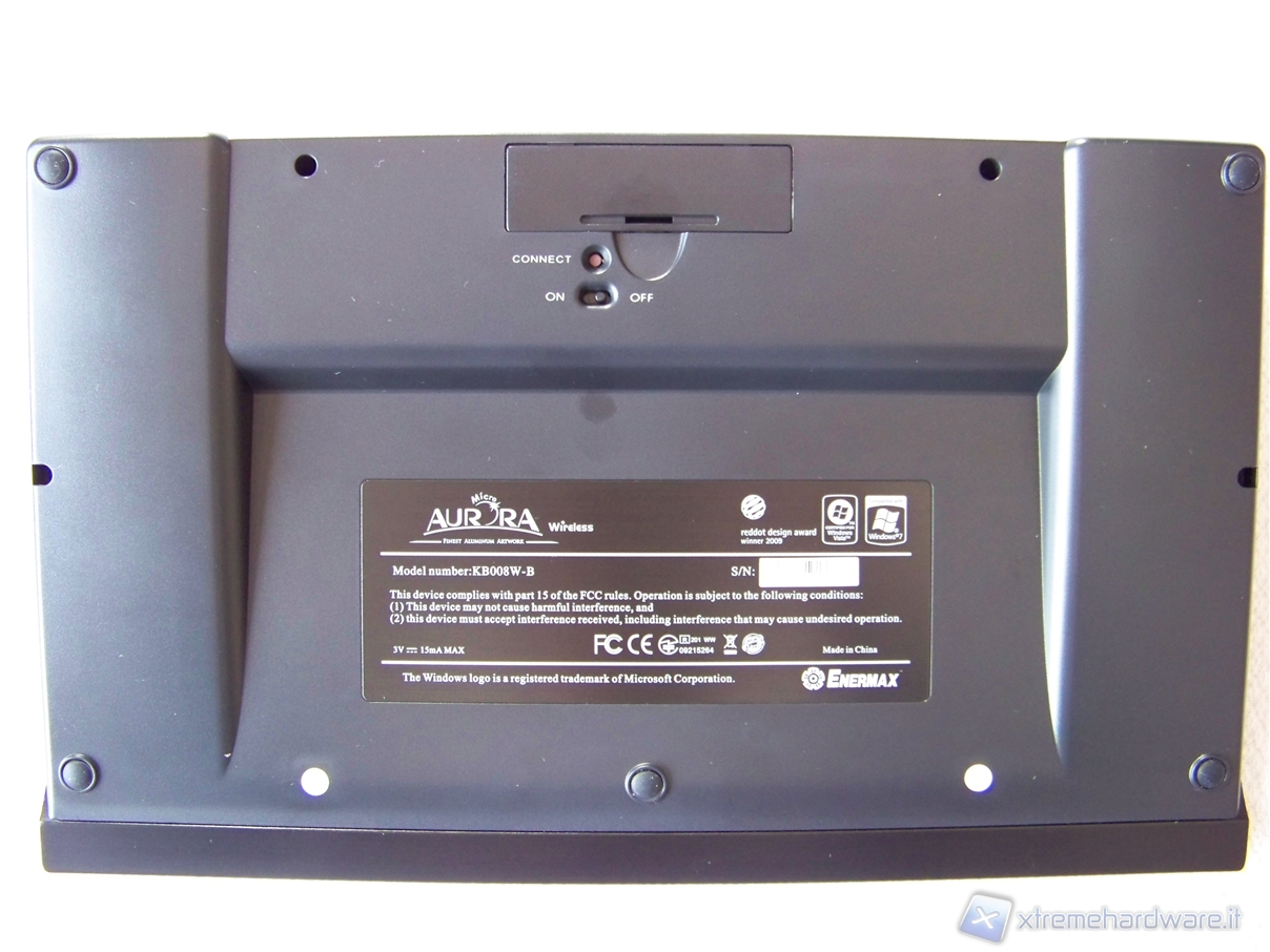 Il ricevitore wireless USB è, come potete vedere dalle immagini che lo riportano accanto alla tastiera, di ridotte dimensioni e di un nero lucido riportante il logo e la scritta Enermax ed un bottone che permette di accoppiarlo alla tastiera, dotata anch’essa del medesimo bottone sul retro insieme all’etichetta riportante il nome del prodotto ed altre informazioni.