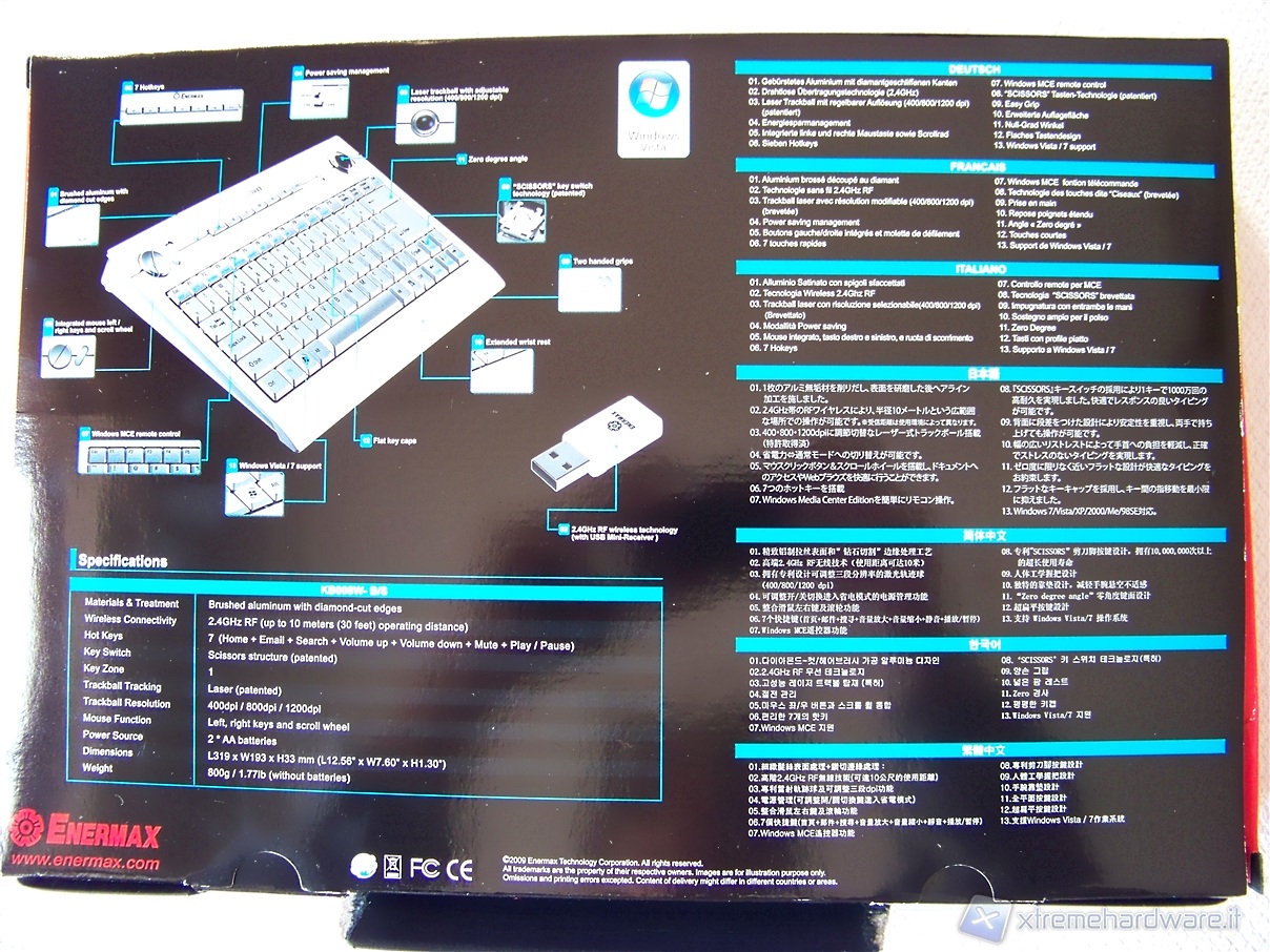 Sul retro troviamo una legenda che spiega in maniera esaustiva ed in ben sette lingue, tra cui l’italiano, le parti che compongono l’Enermax Aurora Micro Wireless e le loro funzioni.