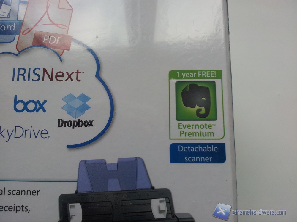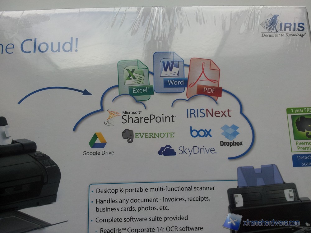 L'intera confezione è ricca di dettagli relativi alle caratteristiche tecniche e alla dotazione dello scanner oggetto della recensione, nella parte frontale troviamo la scritta "You Scan, it connects to the cloud" (tu scannerizzi lui si connette in cloud), l'IRIScan Pro 3 Cloud infatti, come suggerisce lo stesso nome, permette di archiviare direttamente i documenti scansionati in un Cloud Server, come indica l'immagine che segue la scritta è compatibile con i maggiori servizi di Cloud Computing in circolazione come Microsoft Share Point, IRISnext, Google Drive, EverNote, Box, Dropbox e SkyDrive.
