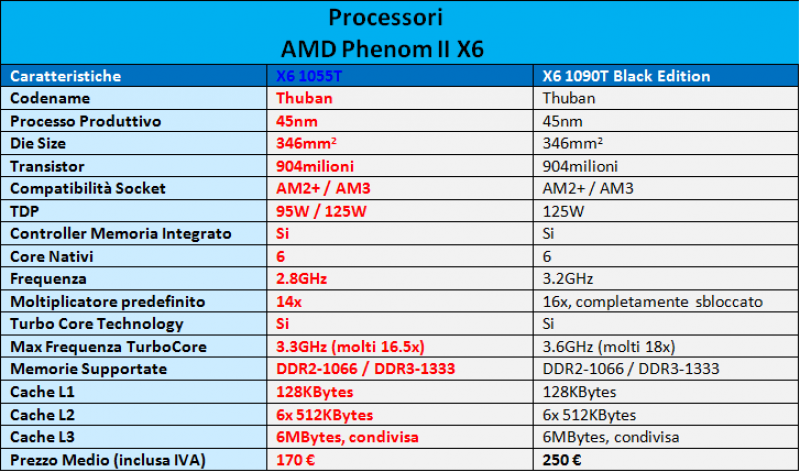 Riassumiamo di seguito tutte le caratteristiche di rilievo della famiglia di processori AMD Phenom II X6: