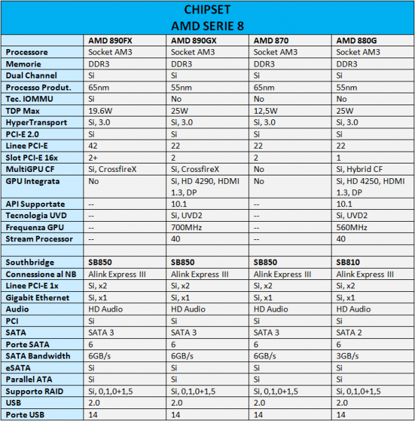 Di seguito vi mostriamo una tabella con tutte le caratteristiche principali di questi chipset e lo schema a blocchi della versione di punta 890FX: