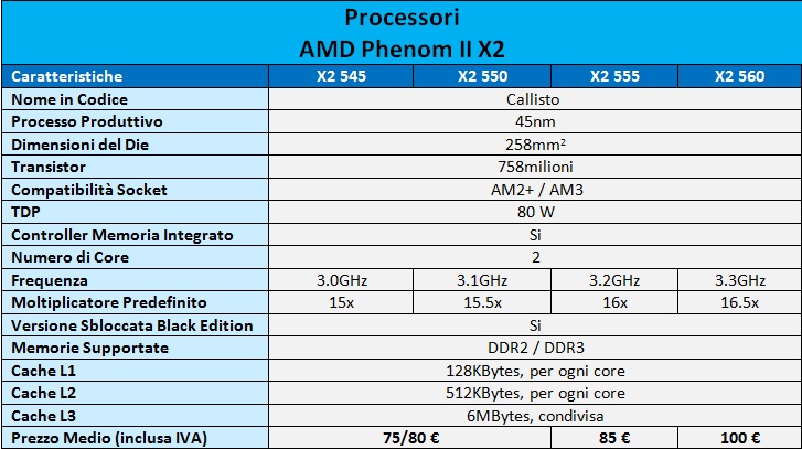 Riassumiamo di seguito tutte le caratteristiche di rilievo della famiglia di processori AMD Phenom II X2:
