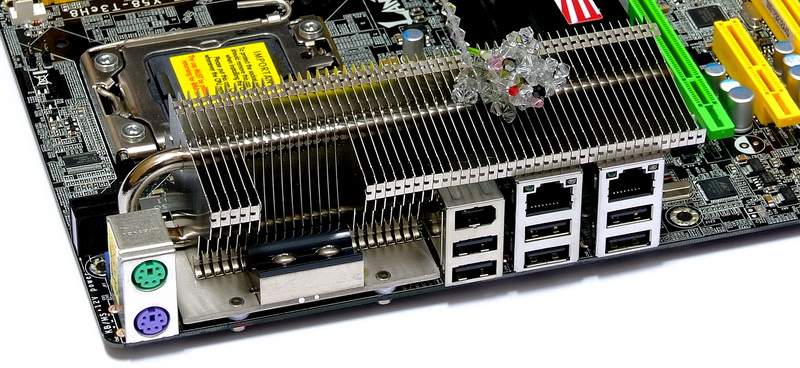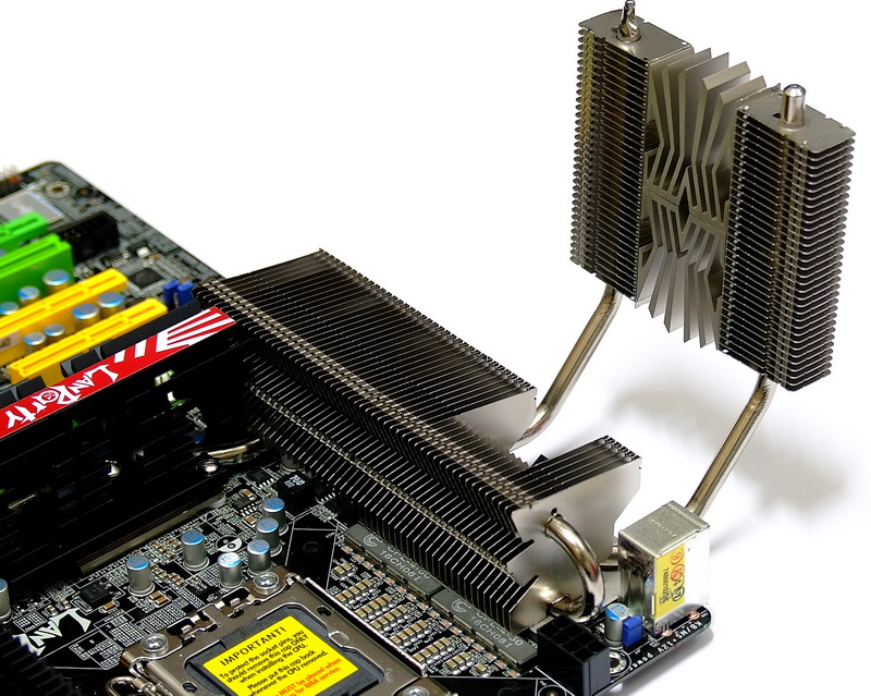 Un ulteriore sguardo al dissipatore per north bridge. Il design di questo cooler aumenta la superficie di scambio termico per eliminare il calore. La facilità con cui si può smontare il dissi ci permette di montare un waterblock senza nessun rischio di danneggiare il NB.
