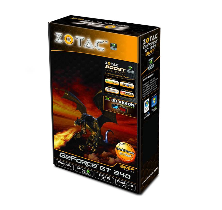 In questa recensione andremo ad analizzare la scheda video Zotac GeForce GT 240 AMP! Edition 512MB GDDR5, caratterizzata dal processo produttivo a 40nm e dalla presenza di memorie GDDR5. Questa soluzione proposta da Zotac garantisce frequenze di funzionamento maggiori rispetto alla versione reference nonché ampi margini di overclock, mantenendo comunque temperature di tutto rispetto grazie al dissipatore proprietario.