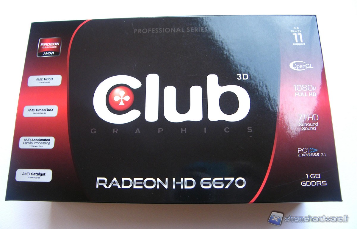La Club 3D HD 6670 è giunta in redazione all'interno di una scatola dalle dimensioni estremamente compatte. I colori che dominano sono, sia anteriormente che posteriormente, il nero ed il rosso. Anteriormente troviamo il nome dell'azienda, grande e di colore bianco, a spiccare sullo sfondo, col classico logo a trifoglio di Club 3D. Sempre sullo stesso lato spicca il nome della scheda, di colore grigio chiaro "Radeon HD 6670". Sono qui anche riportate in maniera estremamente schematica le principali caratteristiche del prodotto, oltre al fatto che fa parte della "professional series" di Club 3D.