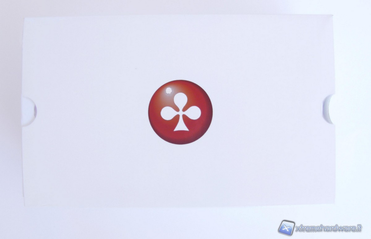 Aperta la scatola esterna, che notiamo costituita da cartoncino sottile, estraiamo una scatola collocata al suo interno di circa le stesse dimensioni, costituita da cartoncino ben più spesso. Notiamo che quest'ultima è quasi completamente bianca, con l'eccezione del logo del trifoglio, simbolo scelto dall'azienda, di grosse dimensioni, collocato al centro del lato anteriore, caratterizzato dal colore bianco su sfondo rosso.