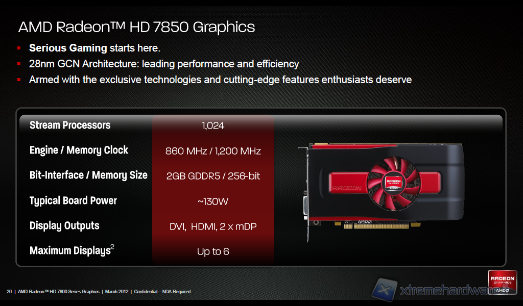 Pitcairn possiamo vederlo come un intero raddoppio delle parti che compongono il chip grafico Cape Verde, presente nelle Radeon HD 7700. Pitcairn ha raddoppiato il numero di Computer Units, ha raddoppiato le  ROPs presenti all’interno del chip, ha raddoppiato la Bandwidth della memoria e, sul frontend, ha raddoppiato la capacità del geometry engine. Nel modello Pitcairn XT abbiamo la presenza di 20 CUs, 1280 Stream Processors, 80 Texture Units e ben 32 ROPs. Mentre nel modello Pitcairn PRO che equipaggia il modello HD 7850 abbiamo una piccola riduzione, infatti le CUs sono 16, gli SP passano a 1024, le TUs a 64, mentre le ROPs rimangono invariate a 32.  Inoltre entrambi i chip sono dotati di 512KB L2 cache ed un controller del bus di memoria a 256-bit.
