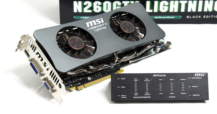 La serie Lightning non ha fatto la sua prima apparizione con le AMD serie 7000 o le Nvidia serie 600, le prime proposte, anche se molto performanti, non si differenziavano molto dalle altre schede video per quanto riguarda il design, se vogliamo dirla tutta la N260GTX Lightning era abbastanza bruttina, l'unica differenza a livello stilistico del dissipatore Twin Frozr I risiedeva nell'utilizzo di un frame più scuro utilizzato però esclusivamente per la Black Edition, più dedita all'overclock e accessoriata con il pannello AirForce che purtroppo non riscosse molto successo.