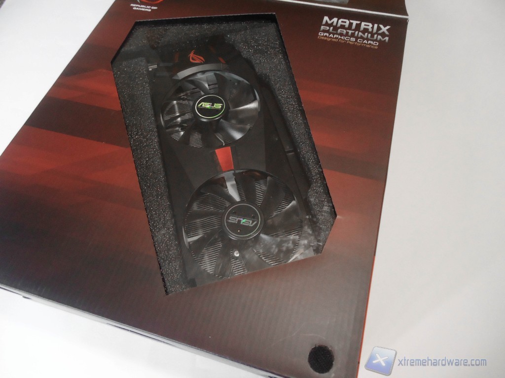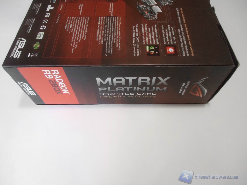 Analizziamo brevemente l’enorme scatola in cui è riposta questo gioiellino di scheda video. Come possiamo vedere nella parte frontale, su sfondo rosso, abbiamo il nome completo del prodotto da noi recensito e i loghi di ASUS e ROG piazzati in alto. La scatola presenta un’apertura simil block-notes dove nella parte inferiore trova alloggio la finestra che ci permette di vedere la scheda prima di aprire la scatola. Nella parte superiore troviamo descritte, mediante didascalie, interessanti features che caratterizzano la 280X Matrix Platinum.