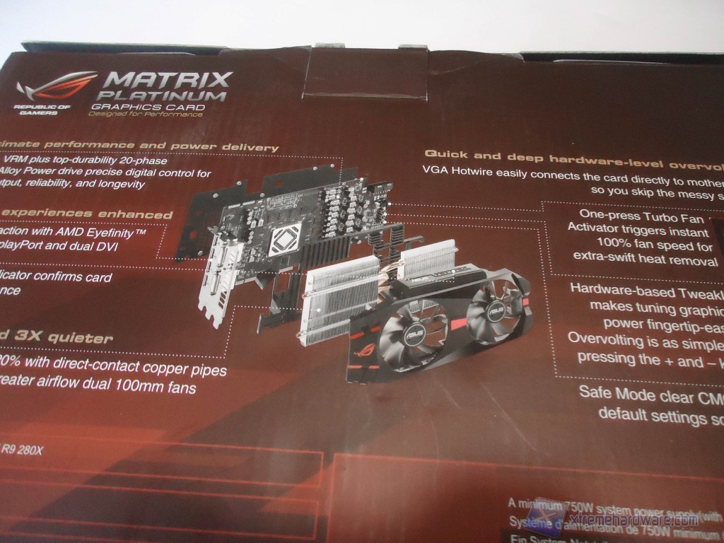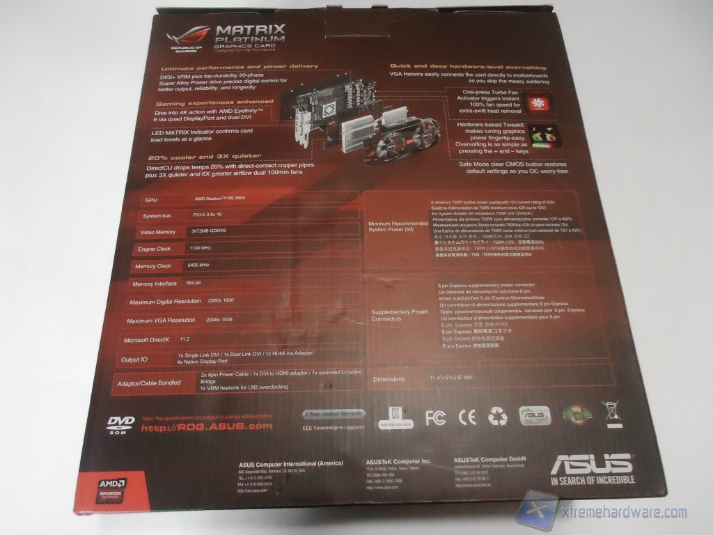La parte posteriore elenca le specifiche tecniche del prodotto e riporta un’immagine esplosa della scheda che ci permette di vedere come è strutturata la Matrix Platinum sotto il dissipatore.