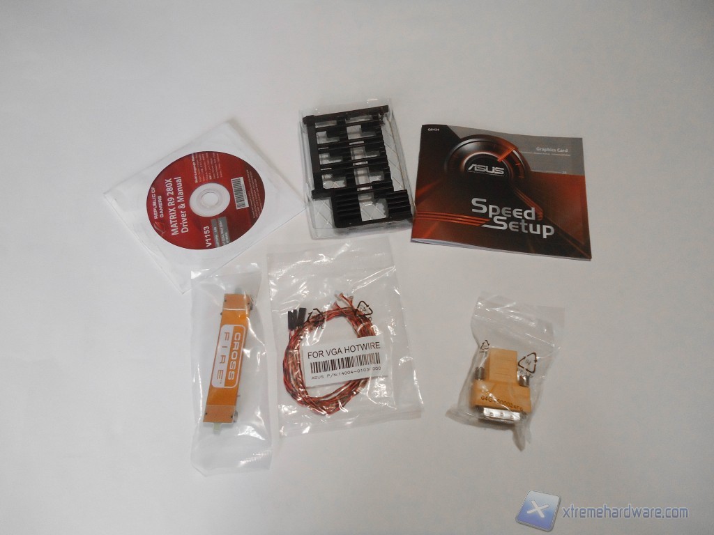 Il bundle comprende: un adattatore DVI-HDMI, un bridge CrossFire, un dissipatore in alluminio per i VRM da usare in caso di overclock sotto LN2, cavi per la modifica delle tensioni (VGA Hotwire), manuale, CD driver e infine un piccolo steacker ROG.