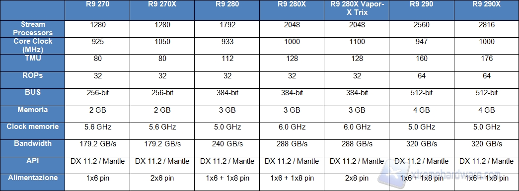 Come possiamo vedere dalla tabella superiore la nostra scheda 280X della Sapphire si piazza appena sotto i due modelli di punta di casa AMD. Per la scheda di Sapphire abbiamo 2048 Stream Processors operanti alla frequenza di 1100 MHz, quindi +100MHz rispetto alla soluzione stock, mentre le memorie non sono overcloccate di fabbrica e sono operanti a 1500 MHz (6000 MHz effettivi). Le 128 TMU, le 32 ROPs e la bandwidth di 288GB/s rendono questa scheda perfetta per il gioco in Full-HD. A differenza delle altre schede reference, la nostra scheda richiede due connettori di alimentazione 8-Pin, ciò è dovuto all’overclock di fabbrica che fa raggiungere a questa scheda un TDP di circa 300W quando utilizziamo la scheda al massimo delle sue potenzialità.
