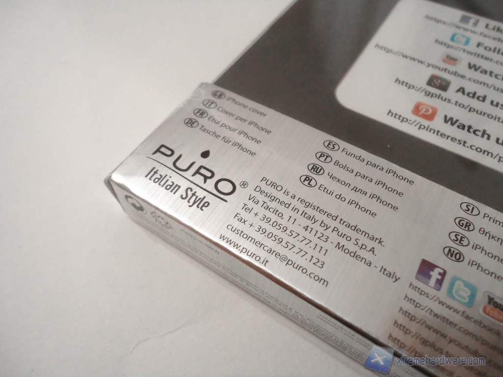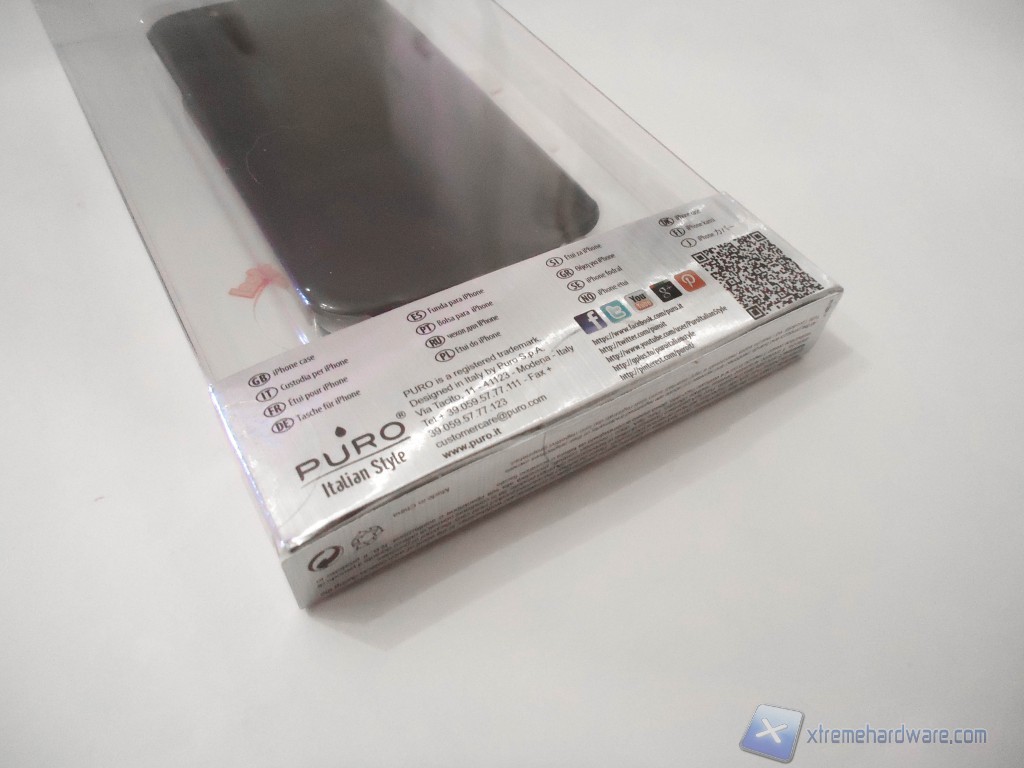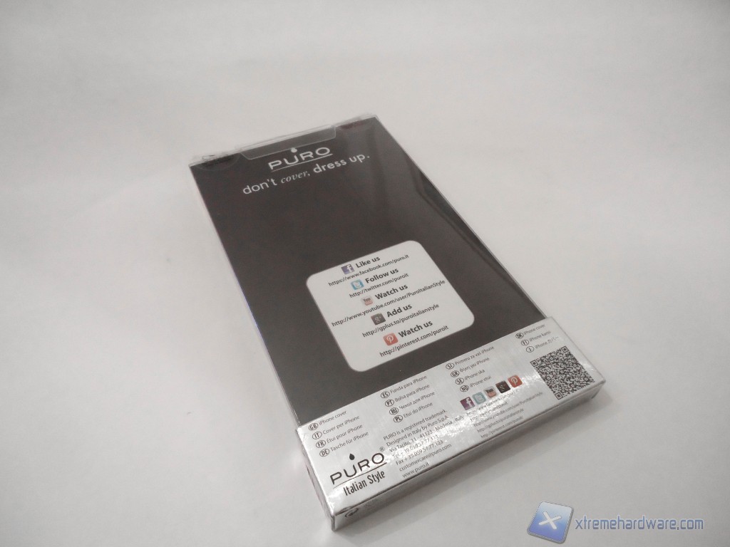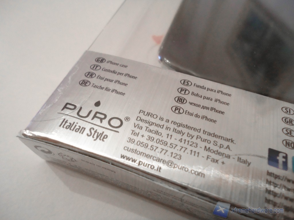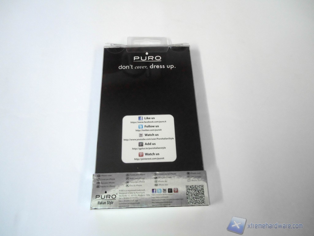 Girando le due scatole notiamo una prima differenza tra le due. Posteriormente la custodia della cover Glitter presenta un cartoncino nero dove sono riportate il logo dell’azienda e il relativo motto ed inoltre alcuni indirizzi web utili per essere sempre aggiornati sui prodotti PURO. L’altra custodia invece non presenta questo cartoncino e permette di vedere il posteriore della Flipper Case. Sul cartoncino argentato presente in basso troviamo le informazioni relative all’azienda.