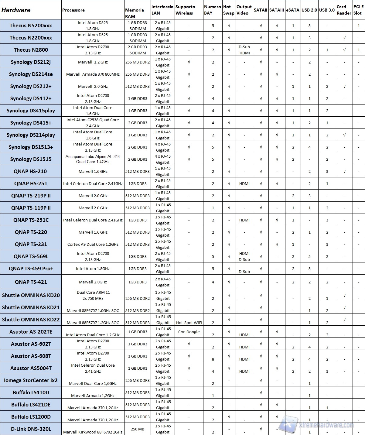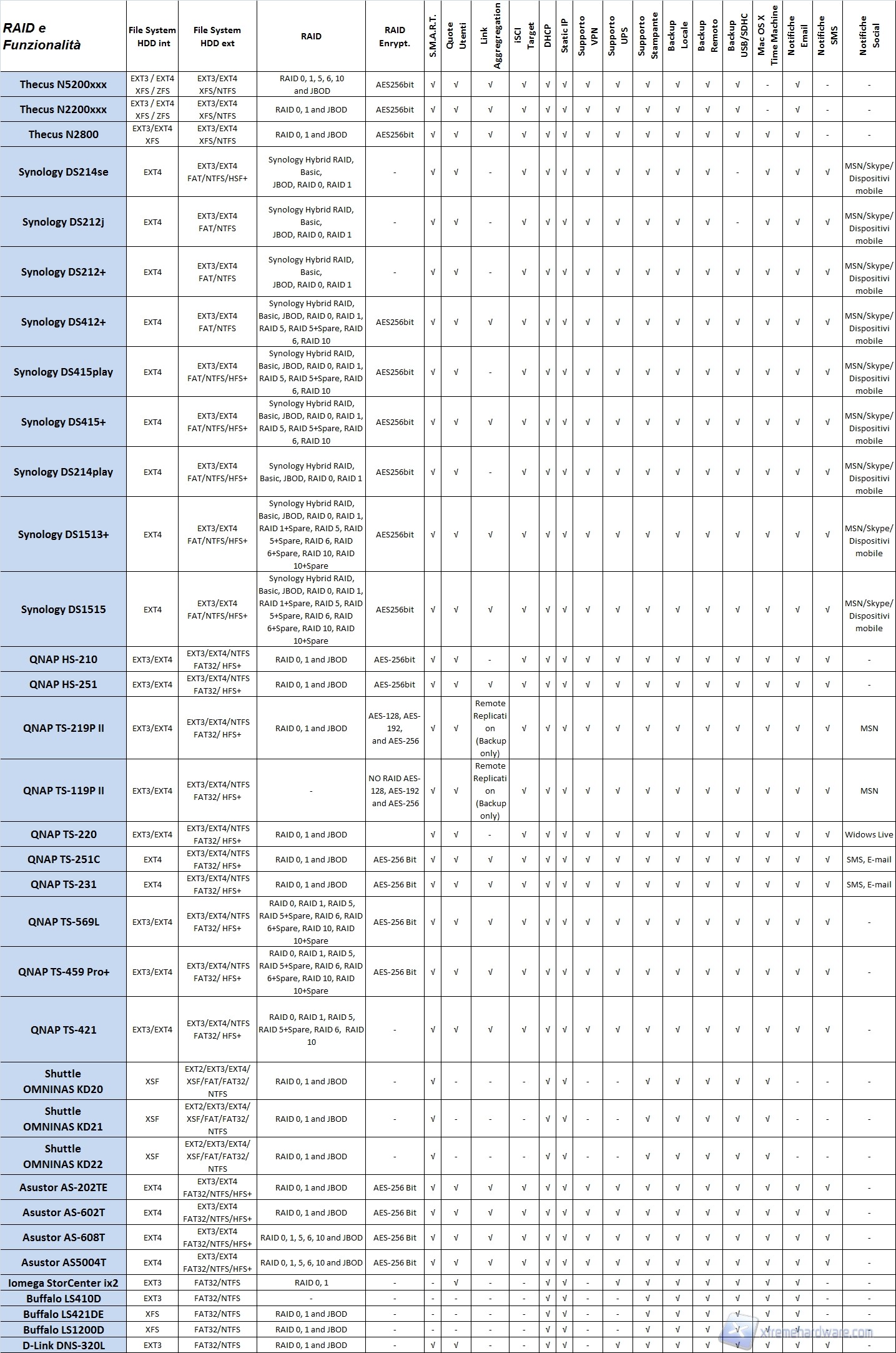 Riportiamo, inoltre, la tabella comparativa delle caratteristiche principali di tutti i NAS recensiti e testati per voi fino ad ora.